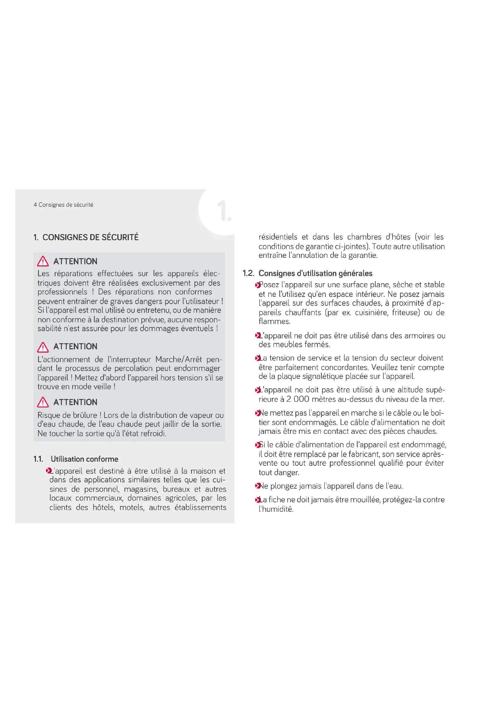 L'appareil est destiné à être utilisé à la maison et dans des applications similaires telles que les cui- sines de personnel, magasins, bureaux et autres locaux commerciaux, domaines agricoles, par les clients des hôtels, motels, autres établissements résidentiels et dans les chambres d'hôtes (voir les conditions de garantie ci-jointes). Toute autre utilisation entraîne l'annulation de la garantie. 1.2. Consignes d'utilisation générales