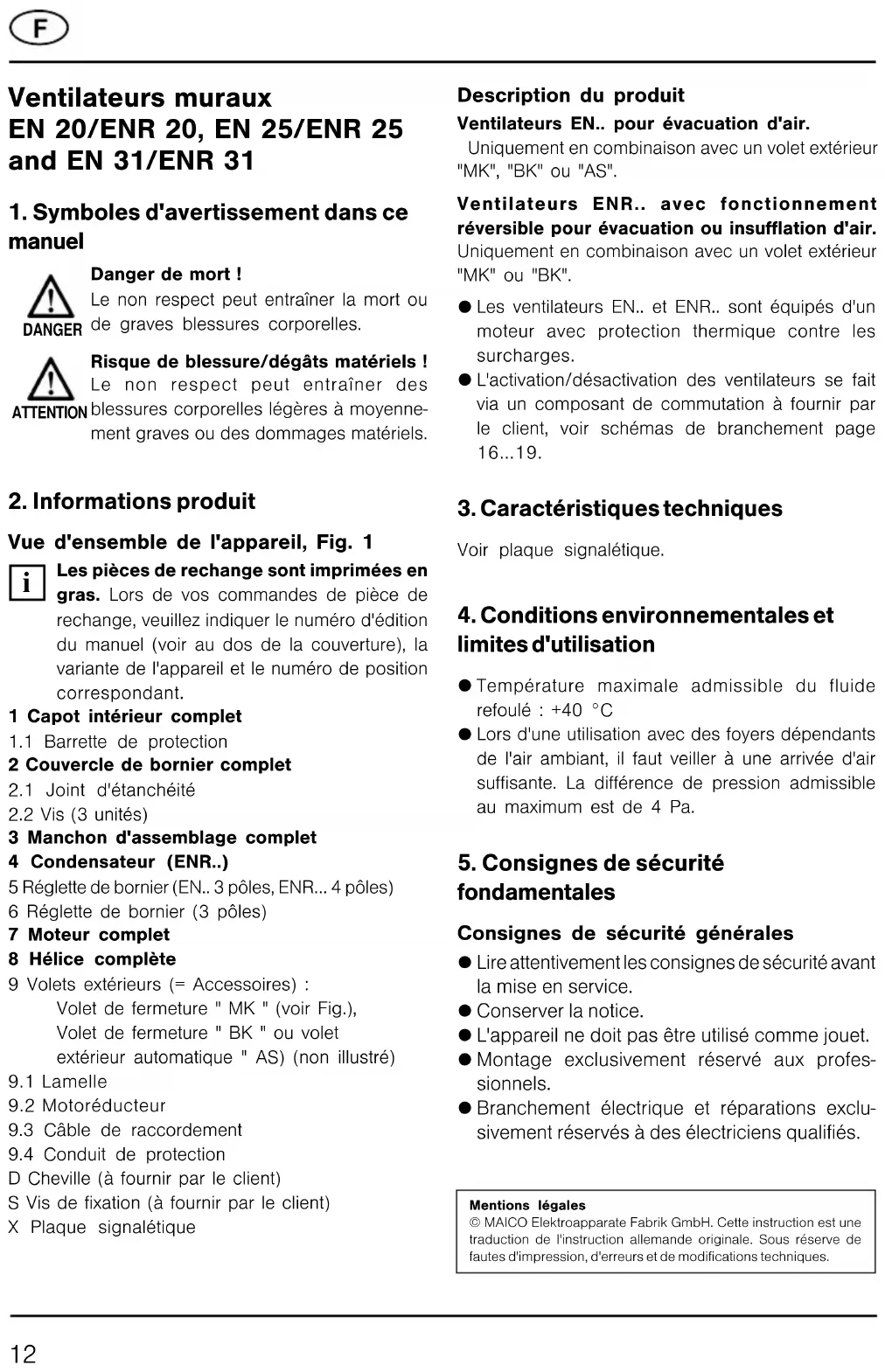 Vue d'ensemble de l'appareil, Fig. 1 Les pièces de rechange sont imprimées engras. Lors de vos commandes de pièce derechange, veuillez indiquer le numéro d'éditiondu manuel (voir au dos de la couverture), lavariante de l'appareil et le numéro de positioncorrespondant.1 Capot intérieur complet1.1 Barrette de protection2 Couvercle de bornier complet2.1 Joint d'étanchéité2.2 Vis (3 unités)3 Manchon d'assemblage complet4 Condensateur (ENR..)5 Réglette de bornier (EN.. 3 pôles, ENR… 4 pôles)6 Réglette de bornier (3 pôles)7 Moteur complet8 Hélice complète9 Volets extérieurs (= Accessoires) :Volet de fermeture " MK " (voir Fig.),Volet de fermeture " BK " ou voletextérieur automatique " AS) (non illustré)9.1 Lamelle9.2 Motoréducteur9.3 Câble de raccordement9.4 Conduit de protectionD Cheville (à fournir par le client)S Vis de fixation (à fournir par le client)X Plaque signalétique Description du produit Ventilateurs EN.. pour évacuation d'air. Uniquement en combinaison avec un volet extérieur"MK", "BK" ou "AS".Ventilateurs ENR.. avec fonctionnementréversible pour évacuation ou insufflation d'air.Uniquement en combinaison avec un volet extérieur"MK" ou "BK". Les ventilateurs EN.. et ENR.. sont équipés d'unmoteur avec protection thermique contre lessurcharges. L'activation/désactivation des ventilateurs se faitvia un composant de commutation à fournir parle client, voir schémas de branchement page16...19.