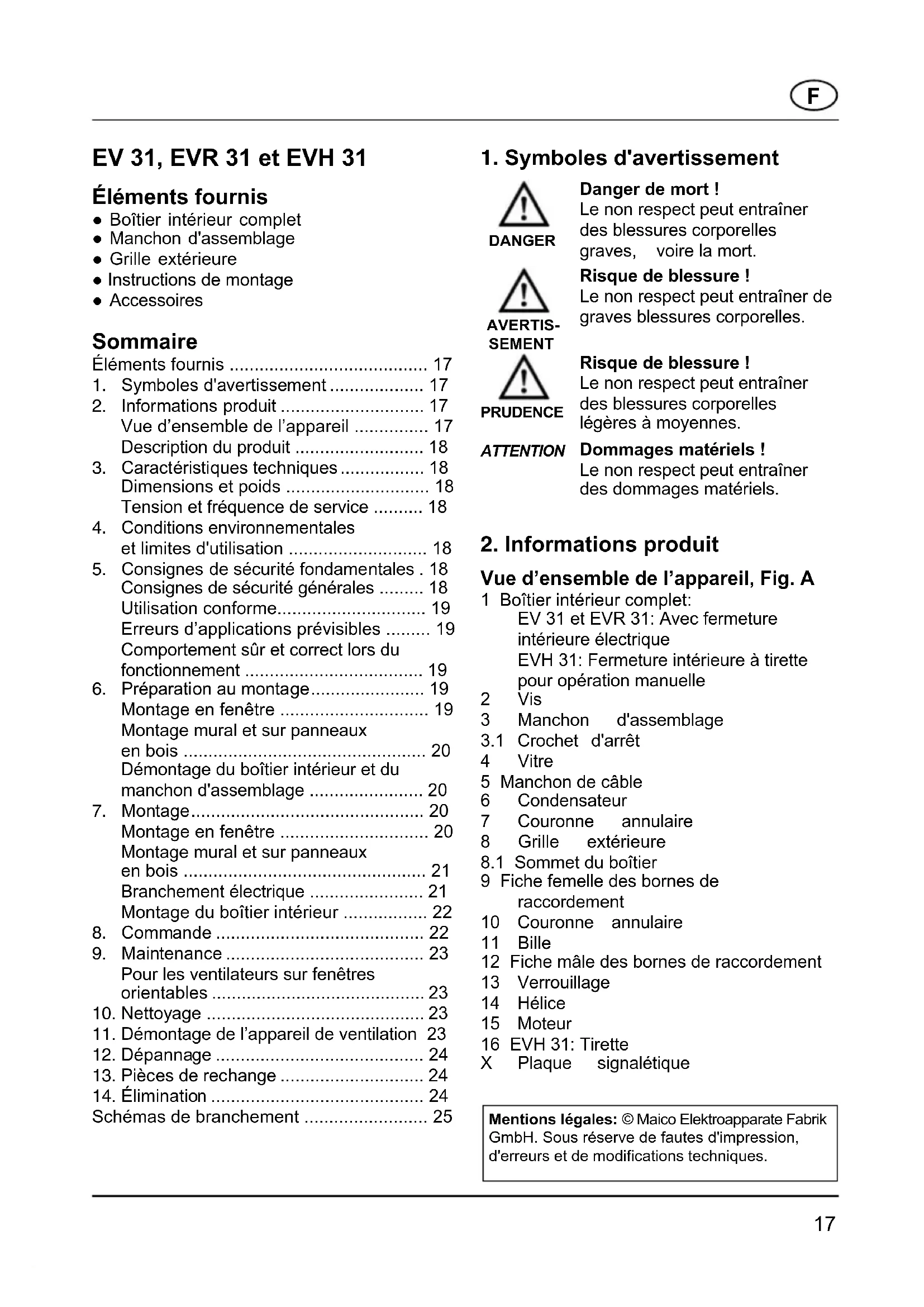 Vue d’ensemble de l’appareil, Fig. A 1 Boîtier intérieur complet: EV 31 et EVR 31: Avec fermeture intérieure électrique EVH 31: Fermeture intérieure à tirette pour opération manuelle 2 Vis 3 Manchon d'assemblage 3.1 Crochet d'arrêt 4 Vitre 5 Manchon de câble 6 Condensateur 7 Couronne annulaire 8 Grille extérieure 8.1 Sommet du boîtier 9 Fiche femelle des bornes de raccordement 10 Couronne annulaire 11 Bille 12 Fiche mâle des bornes de raccordement 13 Verrouillage 14 Hélice 15 Moteur 16 EVH 31: Tirette X Plaque signalétique Mentions légales: © Maico Elektroapparate Fabrik GmbH. Sous réserve de fautes d'impression, d'erreurs et de modifications techniques. F18 Description du produit, Schémas de branchement, voir page 25 ● EV 31 avec fermeture intérieure électrique. Pour l’évacuation d’air. A vitesse variable. Marche/Arrêt avec interrupteur d'éclairage ou interrupteur séparé (les deux à fournir par le client). Le ventilateur se met immédiatement en marche/arrêt si l'on actionne l'interrupteur. Fermeture/ouverture automatique de la fermeture intérieure. ● EVR 31 avec fermeture intérieure électrique. Pour l’insufflation ou l’évacuation de l’air. A vitesse variable. Marche/Arrêt avec inverseur, interrupteur d'éclairage ou interrupteur séparé (les trois à fournir par le client). Le ventilateur se met immédiatement en marche/ à l’arrêt en cas d’activation de l’interrupteur, la fermeture intérieure s’ouvre/se ferme automatique- ment. ● EVH 31 avec fermeture intérieure et tirette de 1 m de longueur pour l’opération manuelle. Pour l’évacuation d’air. Le ventilateur se met en marche/à l’arrêt si la tirette est tirée. La fermeture intérieure s’ouvre/se ferme mécaniquement.