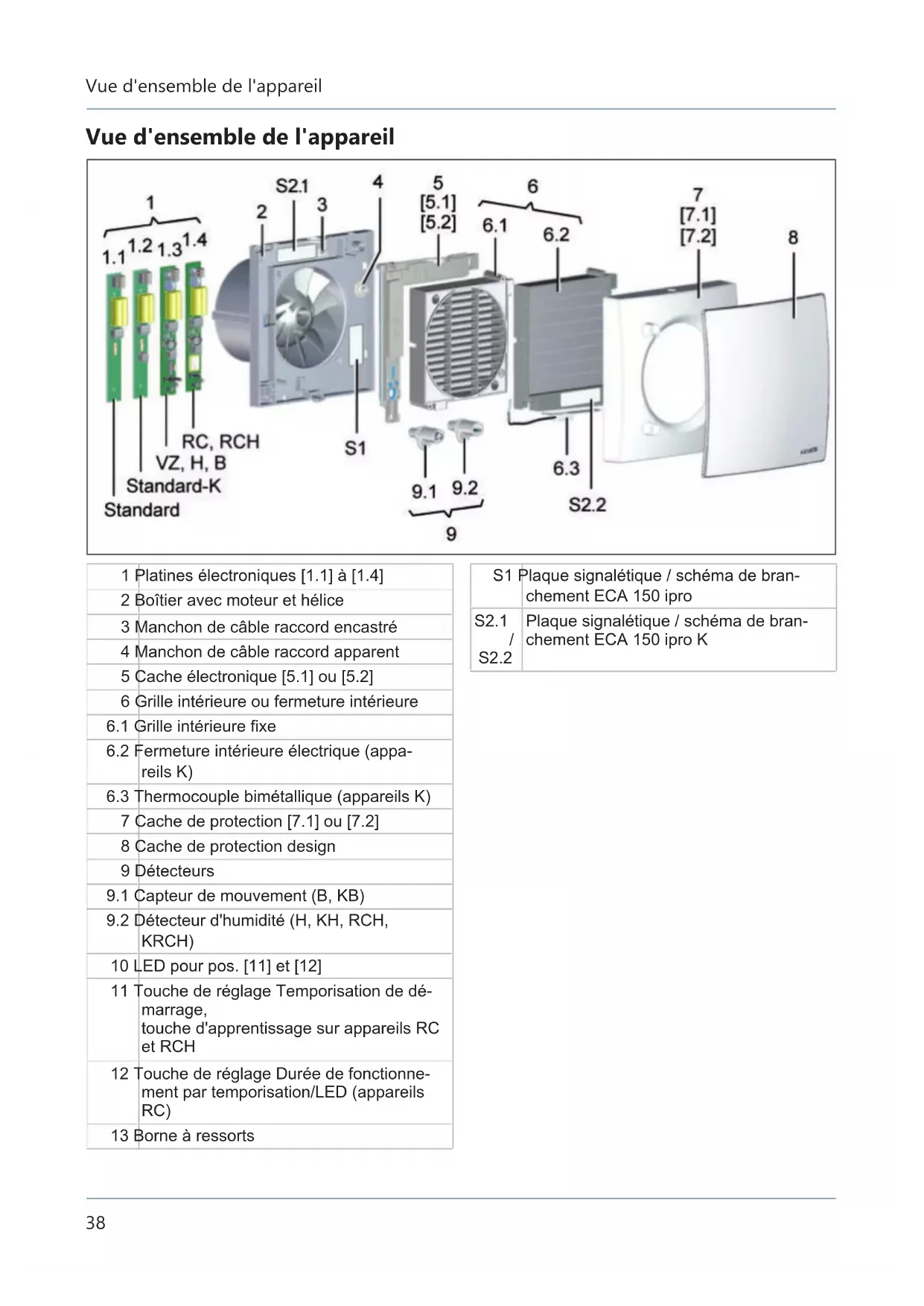 KRCH) 10 LED pour pos. [11] et [12] 11 Touche de réglage Temporisation de dé- marrage, touche d'apprentissage sur appareils RC et RCH 12 Touche de réglage Durée de fonctionne- ment par temporisation/LED (appareils RC) 13 Borne à ressorts S1 Plaque signalétique/ schéma de bran- chement ECA150ipro S2.1