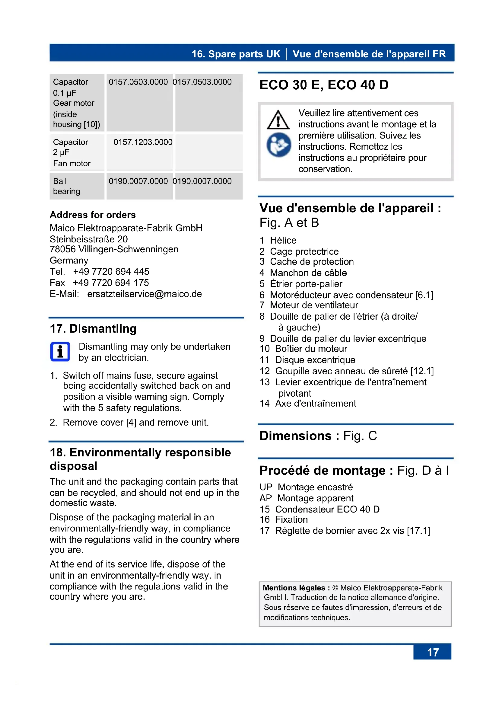 Veuillez lire attentivement ces instructions avant le montage et la première utilisation. Suivez les instructions. Remettez les instructions au propriétaire pour conservation. Vue d'ensemble de l'appareil : Fig. A et B 1 Hélice 2 Cage protectrice 3 Cache de protection 4 Manchon de câble 5 Étrier porte-palier 6 Motoréducteur avec condensateur [6.1] 7 Moteur de ventilateur 8 Douille de palier de l'étrier (à droite/ à gauche) 9 Douille de palier du levier excentrique 10 Boîtier du moteur 11 Disque excentrique 12 Goupille avec anneau de sûreté [12.1] 13 Levier excentrique de l'entraînement pivotant 14 Axe d'entraînement Dimensions : Fig. C Procédé de montage : Fig. D à I UP Montage encastré AP Montage apparent 15 Condensateur ECO 40 D 16 Fixation 17 Réglette de bornier avec 2x vis [17.1] Mentions légales : © Maico Elektroapparate-Fabrik GmbH. Traduction de la notice allemande d'origine. Sous réserve de fautes d'impression, d'erreurs et de modifications techniques.FR │ Sommaire