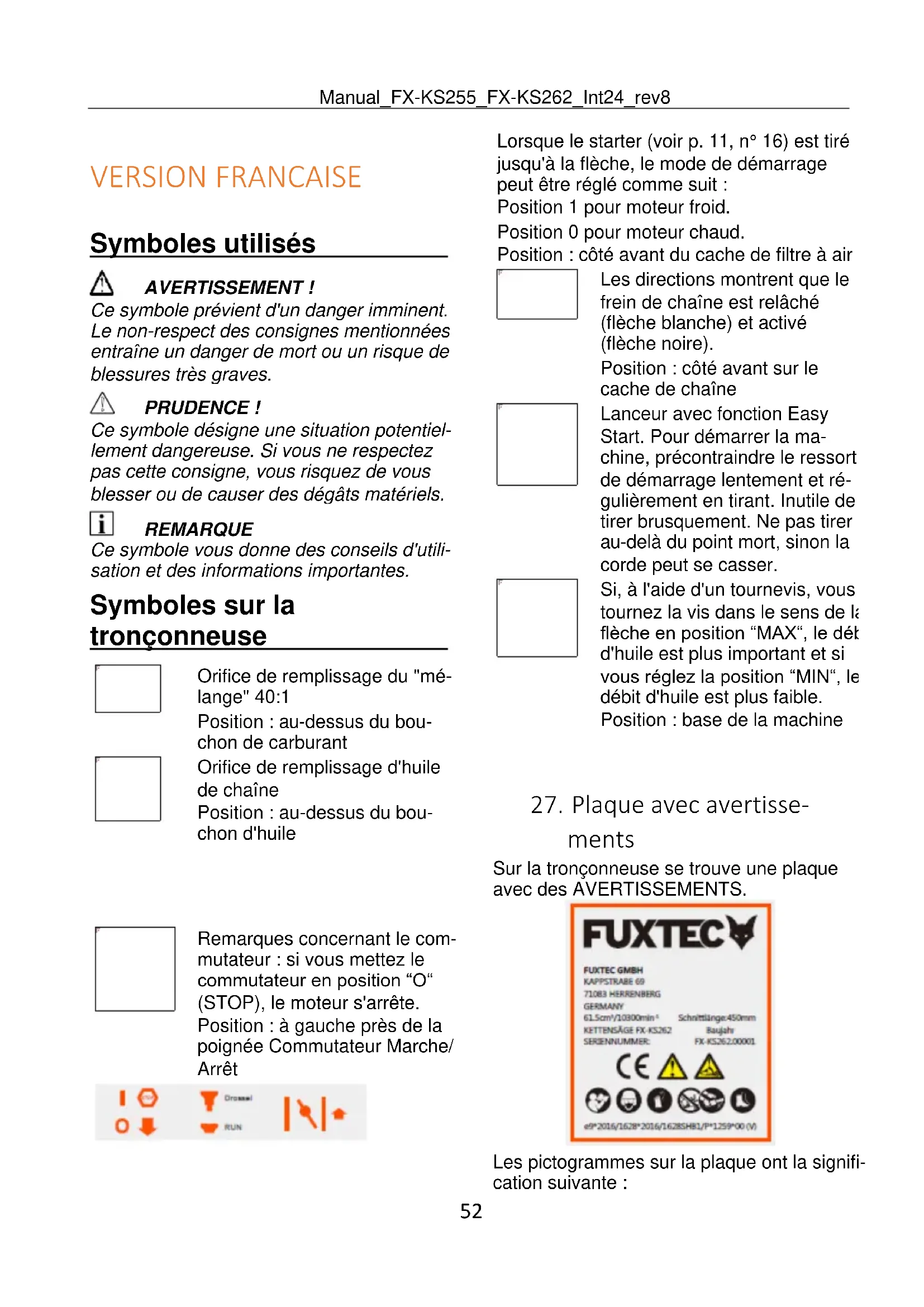PRUDENCE ! La tronçonneuse est dotée d'un système Easy-Start.Manual_FX-KS255_FX-KS262_Int24_rev8