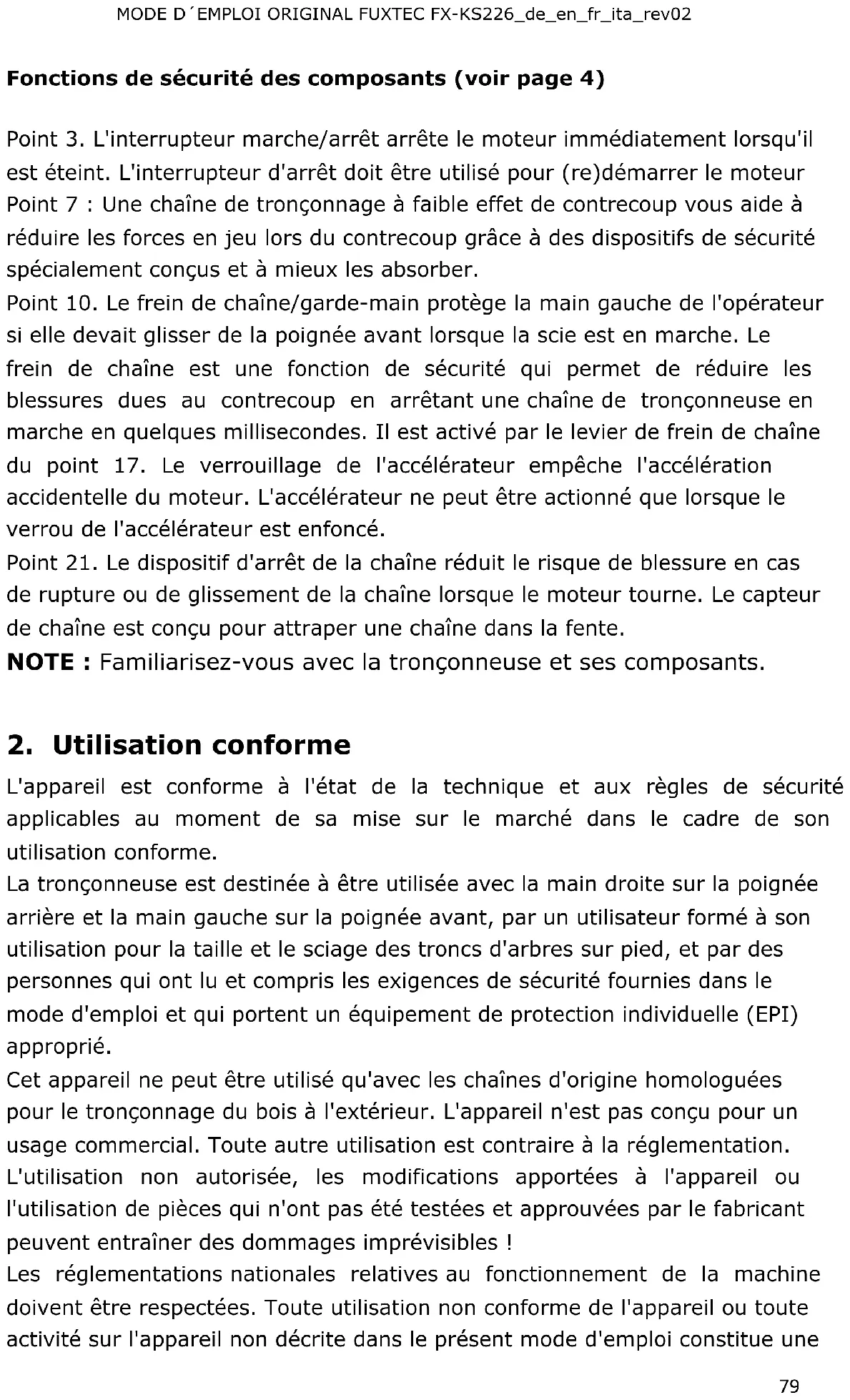 L'appareil est conforme à l'état de la technique et aux règles de sécurité applicables au moment de sa mise sur le marché dans le cadre de son utilisation conforme. La tronçonneuse est destinée à être utilisée avec la main droite sur la poignée arrière et la main gauche sur la poignée avant, par un utilisateur formé à son utilisation pour la taille et le sciage des troncs d'arbres sur pied, et par des personnes qui ont lu et compris les exigences de sécurité fournies dans le mode d'emploi et qui portent un équipement de protection individuelle (EPI) approprié. Cet appareil ne peut être utilisé qu'avec les chaînes d'origine homologuées pour le tronçonnage du bois à l'extérieur. L'appareil n'est pas conçu pour un usage commercial. Toute autre utilisation est contraire à la réglementation. L'utilisation non autorisée, les modifications apportées à l'appareil ou l'utilisation de pièces qui n'ont pas été testées et approuvées par le fabricant peuvent entraîner des dommages imprévisibles ! Les réglementations nationales relatives au fonctionnement de la machine doivent être respectées. Toute utilisation non conforme de l'appareil ou toute activité sur l'appareil non décrite dans le présent mode d'emploi constitue uneManuale Originale di Istruzioni FUXTEC FX-KS226_de_en_fr_ita_rev02