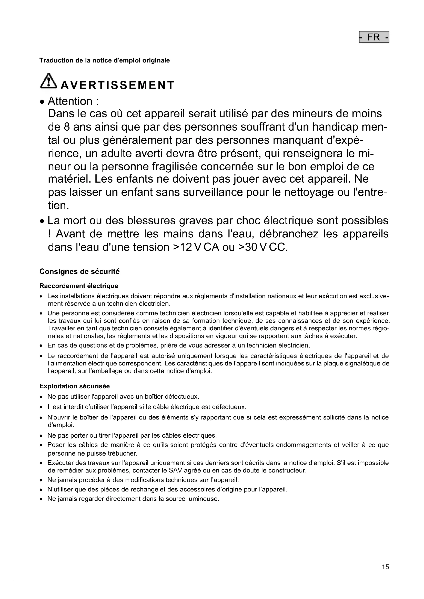 - La mort ou des blessures graves par choc électrique sont possibles ! Avant de mettre les mains dans l'eau, débranchez les appareils dans l'eau d'une tension >12 V CA ou >30 V CC.