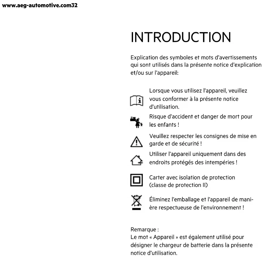 - Mise au rebut FRwww.aeg-automotive.com32 INTRODUCTION Explication des symboles et mots d’avertissements qui sont utilisés dans la présente notice d’explication et/ou sur l’appareil: Lorsque vous utilisez l’appareil, veuillez vous conformer à la présente notice d’utilisation. Risque d’accident et danger de mort pour les enfants ! Veuillez respecter les consignes de mise en garde et de sécurité ! Utiliser l’appareil uniquement dans des endroits protégés des intempéries ! Carter avec isolation de protection (classe de protection II) Éliminez l’emballage et l’appareil de mani- ère respectueuse de l’environnement ! Remarque : Le mot « Appareil » est également utilisé pour désigner le chargeur de batterie dans la présente notice d’utilisation.Français 33 Caractéristiques techniques Modèle LT10 Numéro d’article p. 42