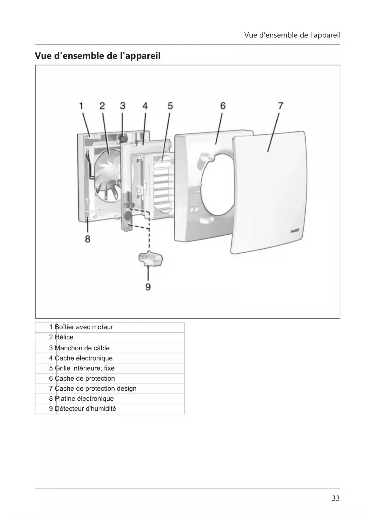 Vue d'ensemble de l'appareil 1 Boîtier avec moteur 2 Hélice 3 Manchon de câble 4 Cache électronique 5 Grille intérieure, fixe 6 Cache de protection 7 Cache de protection design 8 Platine électronique 9 Détecteur d'humiditéSommaire