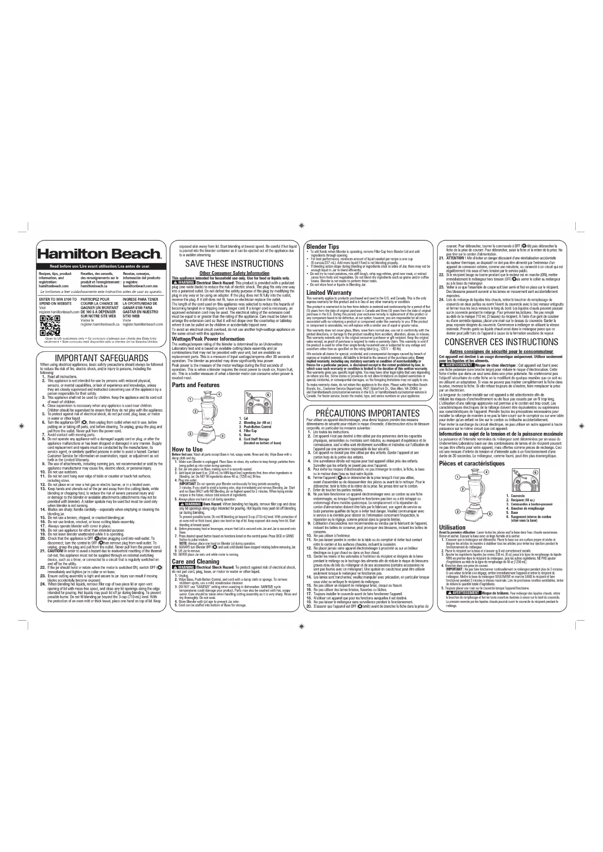 - Pour ajouter des aliments lorsque le mélangeur fonctionne, retirer le bouchon de remplissage du couvercle du mélangeur et ajouter les ingrédients par l’ouverture.• Une recette contenant une quantité minimale de 237 mL (8 oz) est nécessaire pour un rendement optimal. Ajouter du liquide si les aliments ne se mélangent pas correctement.• Si le processus de mélange cesse pendant le fonctionnement ou que les ingrédients collent aux parois du récipient, il faudra peut-être ajouter du liquide dans le récipient pour obtenir un mélange efficace.• Ne pas tenter de piler les pommes de terre, les mélanges de pâtes massives, fouetter des blancs d’oeufs, broyer de la viande crue ou d’extraire des jus de fruits et de légumes. Ne pas mélanger des ingrédients secs comme des grains ou de café. Ce mélangeur n’est pas conçu pour effectuer ce type de transformation.• Ne pas stocker d’aliments ou de liquides dans le récipient du mélangeur. Garantie limitée Cette garantie s’applique aux produits achetés et utilisées aux É.-U. et au Canada. C’est la seule garantie expresse pour ce produit et est en lieu et place de tout autre garantie ou condition. Ce produit est garanti contre tout défaut de matériaux et de main-d’oeuvre pour une période de cinq (5) ans à compter de la date d’achat d’origine au Canada et trois (3) ans à compter de la date d’achat d’origine aux É.-U. Au cours de cette période, votre seul recours est la réparation ou le remplacement de ce produit ou tout composant s’avérant défectueux, à notre gré, mais vous êtes responsable de tous les coûts liés à l’expédition du produit et le retour d’un produit ou d’un composant dans le cadre de cette garantie. Si le produit ou un composant n’est plus offert, nous le remplacerons par un produit similaire de valeur égale ou supérieure.Cette garantie ne couvre pas le verre, les filtres, l’usure d’un usage normal, l’utilisation non conforme aux directives imprimées, ou des dommages au produit résultant d’un accident, modification, utilisation abusive ou incorrecte. Cette garantie s’applique seulement à l’acheteur original ou à la personne l’ayant reçu en cadeau. La présentation du reçu de vente d’origine comme preuve d’achat est nécessaire pour faire une réclamation au titre de cette garantie. Cette garantie s’annule si le produit est utilisé autrement que par une famille ou si l’appareil est soumis à toute tension ou forme d’onde différente des caractéristiques nominales précisées sur l’étiquette (par ex. : 120 V ~ 60 Hz).Nous excluons toutes les réclamations au titre de cette garantie pour les dommages spéciaux, consécutifs et indirects causés par la violation de garantie expresse ou implicite. Toute responsabilité est limitée au prix d’achat. Chaque garantie implicite, y compris toute garantie ou condition de qualité marchande ou d’adéquation à un usage particulier, est exonérée, sauf dans la mesure interdite par la loi, auquel cas la garantie ou condition est limitée à la durée de cette garantie écrite. Cette garantie vous donne des droits légaux précis. Vous pouvez avoir d’autres droits qui varient selon l’endroit où vous habitez. Certaines provinces ne permettent pas les limitations sur les garanties implicites ou les dommages spéciaux ou indirects de telle sorte que les limitations ci-dessus ne s’appliquent peut-être pas à votre cas.Pour faire une réclamation au titre de la garantie, veuillez ne pas retourner cet appareil au magasin. Veuillez nous écrire à Hamilton Beach Brands, Inc., Customer Service Department, 4421 Waterfront Dr., Glen Allen, VA 23060, ou visiter le site hamiltonbeach.com/customer-service aux États-Unis ou hamiltonbeach.ca/customer-service au Canada. Pour obtenir un service plus rapide, veuillez repérer les numéros de modèle, de type et de séries sur votre appareil. SALVAGUARDIAS IMPORTANTES Cuando utilice aparatos eléctricos, siempre deben seguirse precauciones de seguridad básicas a fin de reducir el riesgo de incendio, descarga eléctrica, y/o lesiones a personas, incluyendo las siguientes: