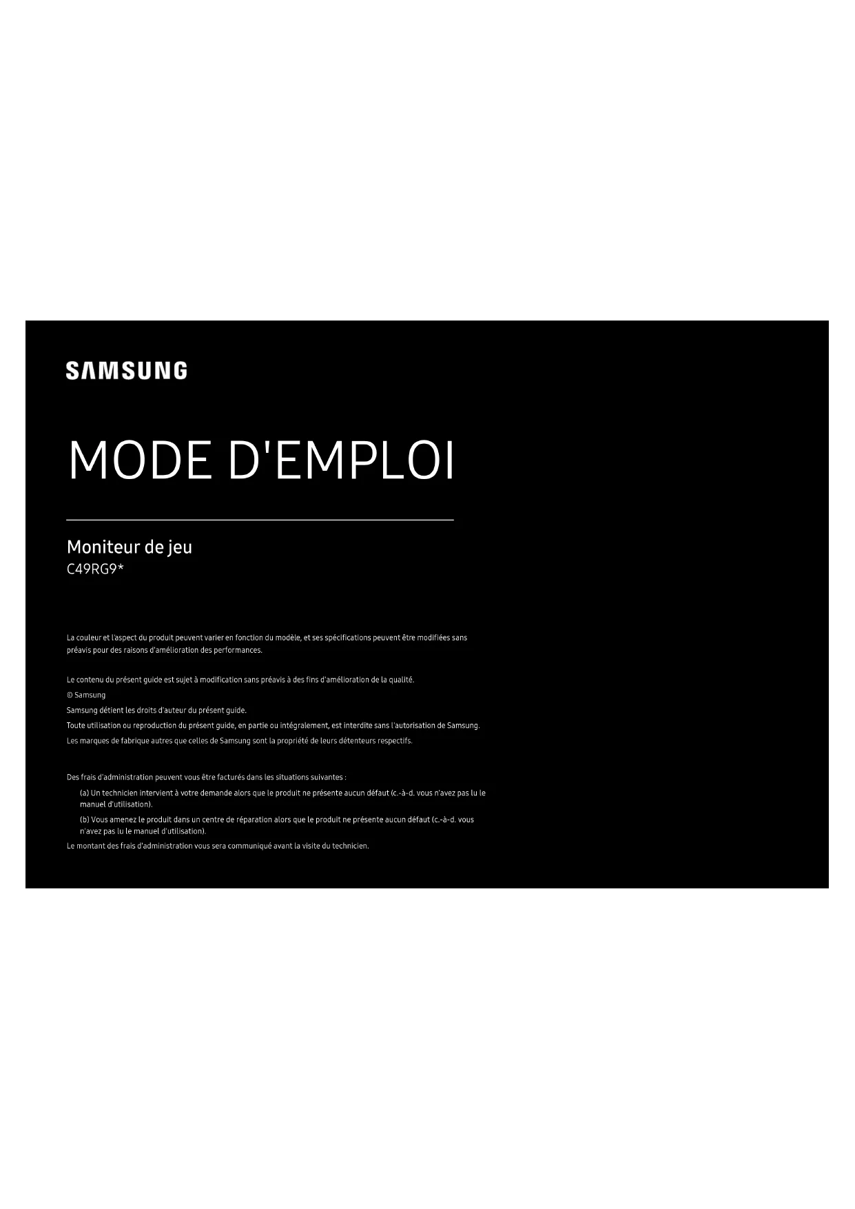 MODE D'EMPLOI C49RG9* Moniteur de jeu La couleur et l'aspect du produit peuvent varier en fonction du modèle, et ses spécifications peuvent être modifiées sans préavis pour des raisons d'amélioration des performances. Le contenu du présent guide est sujet à modification sans préavis à des fins d'amélioration de la qualité. © Samsung Samsung détient les droits d'auteur du présent guide. Toute utilisation ou reproduction du présent guide, en partie ou intégralement, est interdite sans l'autorisation de Samsung. Les marques de fabrique autres que celles de Samsung sont la propriété de leurs détenteurs respectifs. Des frais d'administration peuvent vous être facturés dans les situations suivantes: (a) Un technicien intervient à votre demande alors que le produit ne présente aucun défaut (c.-à-d. vous n'avez pas lu le manuel d'utilisation). (b) Vous amenez le produit dans un centre de réparation alors que le produit ne présente aucun défaut (c.-à-d. vous n'avez pas lu le manuel d'utilisation). Le montant des frais d'administration vous sera communiqué avant la visite du technicien.Table des matières Avant utilisation du produit Sécurisation de l'espace d'installation 4 Précautions de stockage 4 Consignes de sécurité 4 Nettoyage 5 Électricité et sécurité 5 Installation 6 Fonctionnement 7 Préparatifs Pièces 9 Panneau de configuration 9 Guide des touches de fonction 10 Touche de réglage de jeu 11 Modification des paramètres Luminosité, Contraste et Netteté