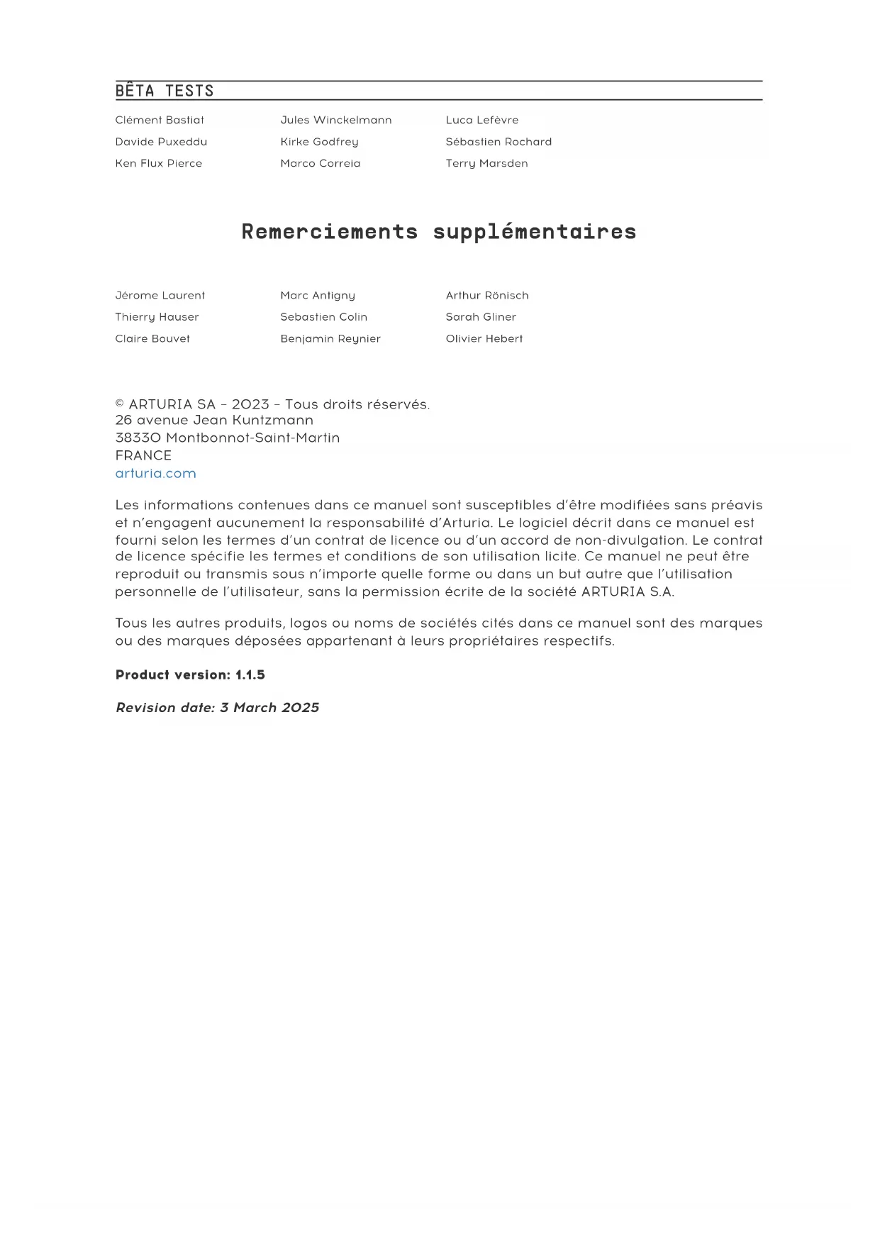 causés par un fonctionnement inapproprié de l’appareil. Spécifications susceptibles d’être modifiées : Les informations figurant dans ce manuel sont considérées comme correctes au moment de l’impression. Cependant, Arturia se réserve le droit de changer ou de modifier les spécifications sans préavis et sans obligation de mettre à jour l’équipement acheté.IMPORTANT : Le produit et son logiciel, lorsqu’utilisés avec un amplificateur, un casque ou des enceintes, peuvent produire des niveaux sonores susceptibles de provoquer une perte d’audition permanente. NE PAS faire fonctionner de manière prolongée à un niveau sonore trop élevé ou inconfortable. En cas de perte auditive ou d’acouphènes, veuillez consulter un ORL.