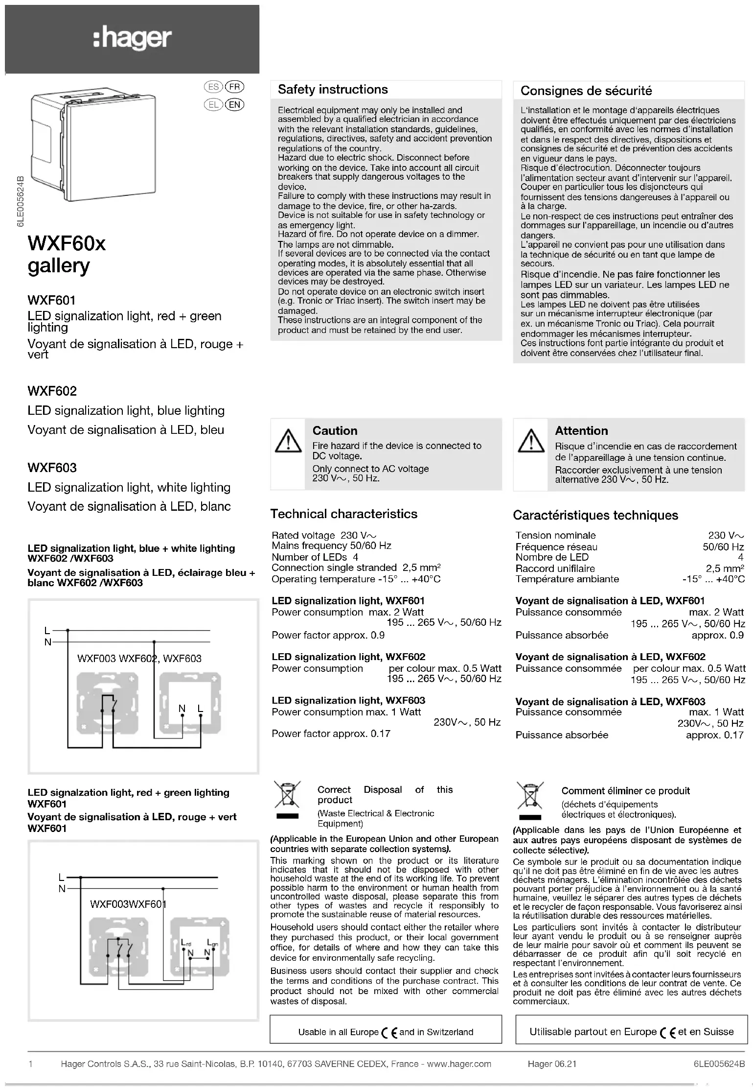WXF003 WXF601LED signalzation light, red + green lighting WXF601Voyant de signalisation à LED, rouge + vert WXF601 Caution Fire hazard if the device is connected to DC voltage. Only connect to AC voltage 230 Vv, 50 Hz. Utilisable partout en Europe et en SuisseComment éliminer ce produit(déchets d’équipements électriques et électroniques). (Applicable dans les pays de l’Union Européenne et aux autres pays européens disposant de systèmes de collecte sélective).Ce symbole sur le produit ou sa documentation indique qu’il ne doit pas être éliminé en n de vie avec les autres déchets ménagers. L’élimination incontrôlée des déchets pouvant porter préjudice à l’environnement ou à la santé humaine, veuillez le séparer des autres types de déchets et le recycler de façon responsable. Vous favoriserez ainsi la réutilisation durable des ressources matérielles.Les particuliers sont invités à contacter le distributeur leur ayant vendu le produit ou à se renseigner auprès de leur mairie pour savoir où et comment ils peuvent se débarrasser de ce produit an qu’il soit recyclé en respectant l’environnement. Les entreprises sont invitées à contacter leurs fournisseurs et à consulter les conditions de leur contrat de vente. Ce produit ne doit pas être éliminé avec les autres déchets commerciaux.Usable in all Europe and in SwitzerlandCorrect Disposal of this product(Waste Electrical & Electronic Equipment) (Applicable in the European Union and other European countries with separate collection systems).This marking shown on the product or its literature indicates that it should not be disposed with other household waste at the end of its working life. To prevent possible harm to the environment or human health from uncontrolled waste disposal, please separate this from other types of wastes and recycle it responsibly to promote the sustainable reuse of material resources.Household users should contact either the retailer where they purchased this product, or their local government ofce, for details of where and how they can take this device for environmentally safe recycling.Business users should contact their supplier and check the terms and conditions of the purchase contract. This product should not be mixed with other commercial wastes of disposal. Consignes de sécurité L‘installation et le montage d‘appareils électriques doivent être effectués uniquement par des électriciens qualifiés, en conformité avec les normes d’installation et dans le respect des directives, dispositions et consignes de sécurité et de prévention des accidents en vigueur dans le pays.Risque d’électrocution. Déconnecter toujours l’alimentation secteur avant d’intervenir sur l’appareil. Couper en particulier tous les disjoncteurs qui fournissent des tensions dangereuses à l’appareil ou à la charge.Le non-respect de ces instructions peut entraîner des dommages sur l’appareillage, un incendie ou d’autres dangers. L’appareil ne convient pas pour une utilisation dans la technique de sécurité ou en tant que lampe de secours. Risque d’incendie. Ne pas faire fonctionner les lampes LED sur un variateur. Les lampes LED ne sont pas dimmables. Les lampes LED ne doivent pas être utilisées sur un mécanisme interrupteur électronique (par ex. un mécanisme Tronic ou Triac). Cela pourrait endommager les mécanismes interrupteur. Ces instructions font partie intégrante du produit et doivent être conservées chez l’utilisateur final. Caractéristiques techniques Tension nominale 230 VvFréquence réseau 50/60 Hz Nombre de LED 4Raccord unifilaire 2,5 mm²Température ambiante -15° ... +40°CVoyant de signalisation à LED, WXF601Puissance consommée max. 2 Watt 195 ... 265 Vv, 50/60 Hz Puissance absorbée approx. 0.9 Voyant de signalisation à LED, WXF602Puissance consommée per colour max. 0.5 Watt 195 ... 265 Vv, 50/60 Hz Voyant de signalisation à LED, WXF603Puissance consommée max. 1 Watt 230V v, 50 HzPuissance absorbée approx. 0.17 Attention Risque d’incendie en cas de raccordement de l ’appareillage à une tension continue. Raccorder exclusivement à une tension alternative 230 Vv, 50 Hz. Hager Controls S.A.S., 33 rue Saint-Nicolas, B.P. 10140, 67703 SAVERNE CEDEX, France - www.hager.com Hager 06.21 6LE005624B16LE005624B Réf produit r a u z WXF601 Luz de señalización LED, iluminación roja + verde Φως σηματοδότησης LED, κόκκινο + πράσινο φωτισμό WXF602 Luz de señalización LED, iluminación azul Φως σηματοδότησης LED, μπλε φωτισμός WXF603 Luz de señalización LED, iluminación blanca. Φως σηματοδότησης LED, λευκός