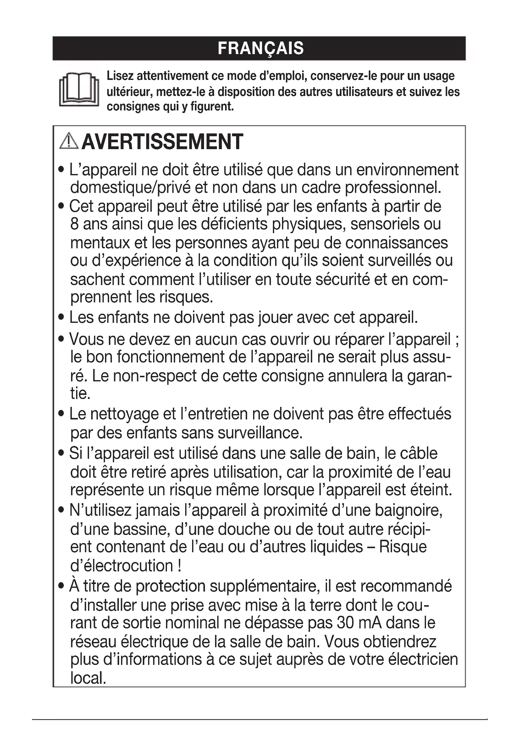 - Si l’appareil est utilisé dans une salle de bain, le câble doit être retiré après utilisation, car la proximité de l’eau représente un risque même lorsque l’appareil est éteint.