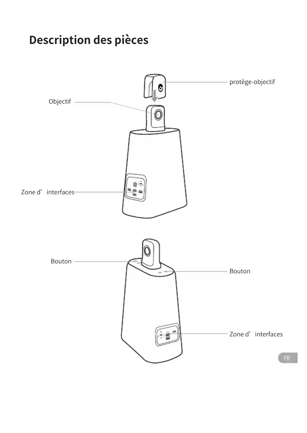 Description des pièces protège-objectif Objectif Bouton Zone d’interfaces Bouton Zone d’interfacesFR Description des boutons Bouton du mode Bouton de volume + et volume - Bouton Muet Bouton d’alimentation Appuyez brièvement sur la fenêtre contextuelle demandant l’option « Arrêter » / « Redémarrer » et le compte à rebours commence, appuyez brièvement à nouveau pour arrêter l’appareil. Régler le volume du haut-parleur Appuyez brièvement sur le microphone pour couper le son Appuyez brièvement pour modifier mode de l’image Appuyez et maintenez pendant secondes pour verrouiller l’angle visuel de l’imageFR Description de signaux lumineux Signal vert clignote En cours du démarrage de l’appareil ou de la mise à jour du système Signal vert Bien prêt Signal bleu clignote En cours de l’enregistrement Signal bleu Le webcam fonctionne Signal rouge MuetFR Description d’interfaces Port Ethernet Alimentation USB-C HDMI IN USB-A Port SORTIE HDMI Connectez un moniteur/un téléviseur pour afficher des images Connecter une souris ou un clavier Alimentez l’appareil via l’adaptateur secteur et le câble d’alimentation Connexion câblée à Ethernet, tout en alimentant l’appareil via Ethernet (PoE) Connectez un ordinateur pour entrer la vidéo, partager l’écran de l’ordinateur connecté Verrou de sécurité Kensington Pour l'antivol d'appareilFR