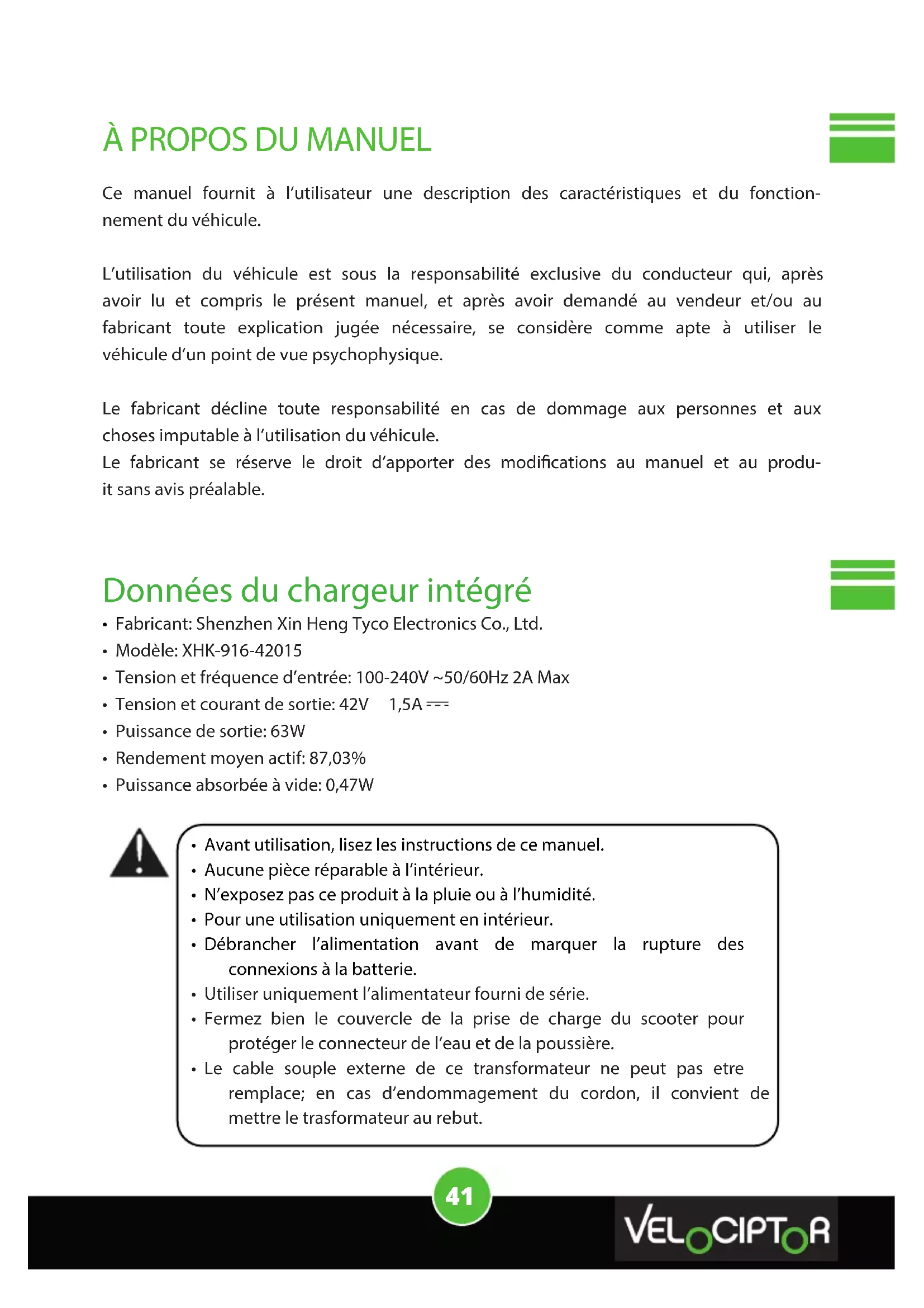 - Garantie Ce manuel fournit à l’utilisateur une description des caractéristiques et du fonction- nement du véhicule. L’utilisation du véhicule est sous la responsabilité exclusive du conducteur qui, après avoir lu et compris le présent manuel, et après avoir demandé au vendeur et/ou au fabricant toute explication jugée nécessaire, se considère comme apte à utiliser le véhicule d’un point de vue psychophysique. Le fabricant décline toute responsabilité en cas de dommage aux personnes et aux choses imputable à l’utilisation du véhicule. Le fabricant se réserve le droit d’apporter des modications au manuel et au produ- it sans avis préalable. Données du chargeur intégré p. 5041