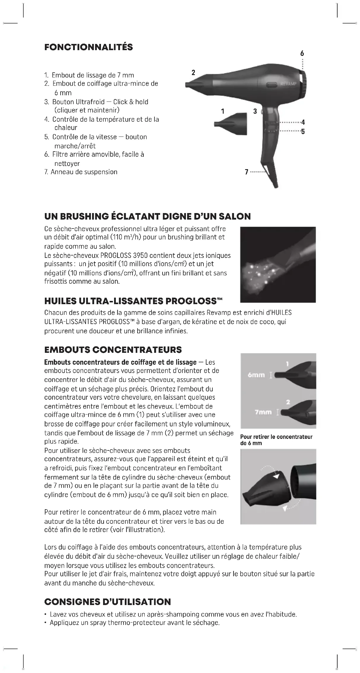 Chacun des produits de la gamme de soins capillaires Revamp est enrichi d’HUILES ULTRA-LISSANTES PROGLOSS™ à base d’argan, de kératine et de noix de coco, qui procurent une douceur et une brillance infinies. EMBOUTS CONCENTRATEURS Embouts concentrateurs de coiffage et de lissage — Les embouts concentrateurs vous permeent d’orienter et de concentrer le débit d’air du sèche-cheveux, assurant un coiffage et un séchage plus précis. Orientez l’embout du concentrateur vers votre chevelure, en laissant quelques centimètres entre l’embout et les cheveux. L’embout de coiffage ultra-mince de 6 mm (1) peut s’utiliser avec une brosse de coiffage pour créer facilement un style volumineux, tandis que l’embout de lissage de 7 mm (2) permet un séchage plus rapide. Pour utiliser le sèche-cheveux avec ses embouts concentrateurs, assurez-vous que l’appareil est éteint et qu’il a refroidi, puis fixez l’embout concentrateur en l’emboîtant fermement sur la tête de cylindre du sèche-cheveux (embout de 7 mm) ou en le plaçant sur la paie avant de la tête du cylindre (embout de 6 mm) jusqu’à ce qu’il soit bien en place. Pour retirer le concentrateur de 6 mm, placez votre main autour de la tête du concentrateur et tirer vers le bas ou de côté afin de le retirer (voir l’illustration). Lors du coiffage à l’aide des embouts concentrateurs, aention à la température plus élevée du débit d’air du sèche-cheveux. Veuillez utiliser un réglage de chaleur faible/ moyen lorsque vous utilisez les embouts concentrateurs. Pour utiliser le jet d’air frais, maintenez votre doigt appuyé sur le bouton situé sur la paie avant du manche du sèche-cheveux.