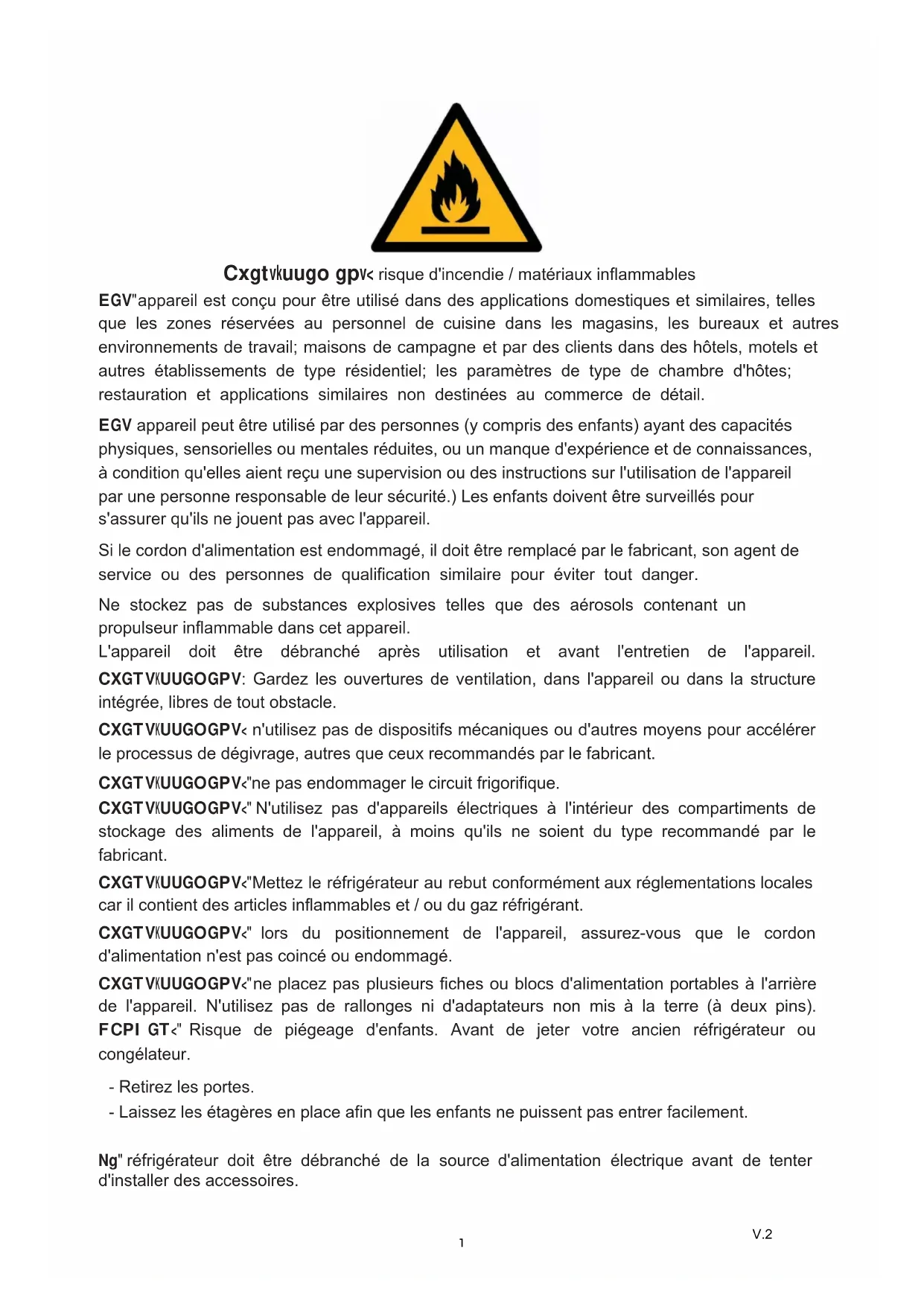 Ceci est un symbole d'interdiction. Tout non-respect des instructions marquées de ce symbole peut entraîner des dommages au produit ou des risques pour la sécurité de l'utilisateur. Ceci est un symbole d'avertissement. Toute opération doit être effectuée en totale conformité avec les instructions marquées de ce symbole, car le non-respect de cette consigne peut entraîner des dommages au produit ou entraîner des risques de blessures. Ceci est un symbole de prudence. Les instructions marquées de ce symbole nécessitent une prudence particulière. Le non-respect de cette consigne peut entraîner des blessures mineures ou modérées et des dommages au produit. Ne tirez pas sur le cordon d'alimentation pour débrancher le réfrigérateur. Tenez fermement la fiche et retirez-la directement de la prise. Pour garantir une utilisation sûre, veillez à ne pas endommager le câble et n'utilisez pas de câbles effilochés ou endommagés. Utilisez une prise dédiée, qui n'est pas partagée avec d'autres appareils électriques. La fiche doit être en contact ferme avec la prise ou cela peut provoquer un incendie. Vérifiez que la terre est correctement connectée. Si du gaz réfrigérant ou d'autres gaz inflammables fuient, fermez la vanne qui fuit et ouvrez les portes et les fenêtres. Ne débranchez pas le réfrigérateur ou tout autre appareil électrique, car une étincelle pourrait provoquer un incendie. Ne placez pas d'autres appareils électriques sur le dessus du réfrigérateur, à moins qu'il ne s'agisse de produits sûrs spécifiés par le fabricant. Symbole d'interdiction Symbole d'avertissement Symbole de mise en garde V.2