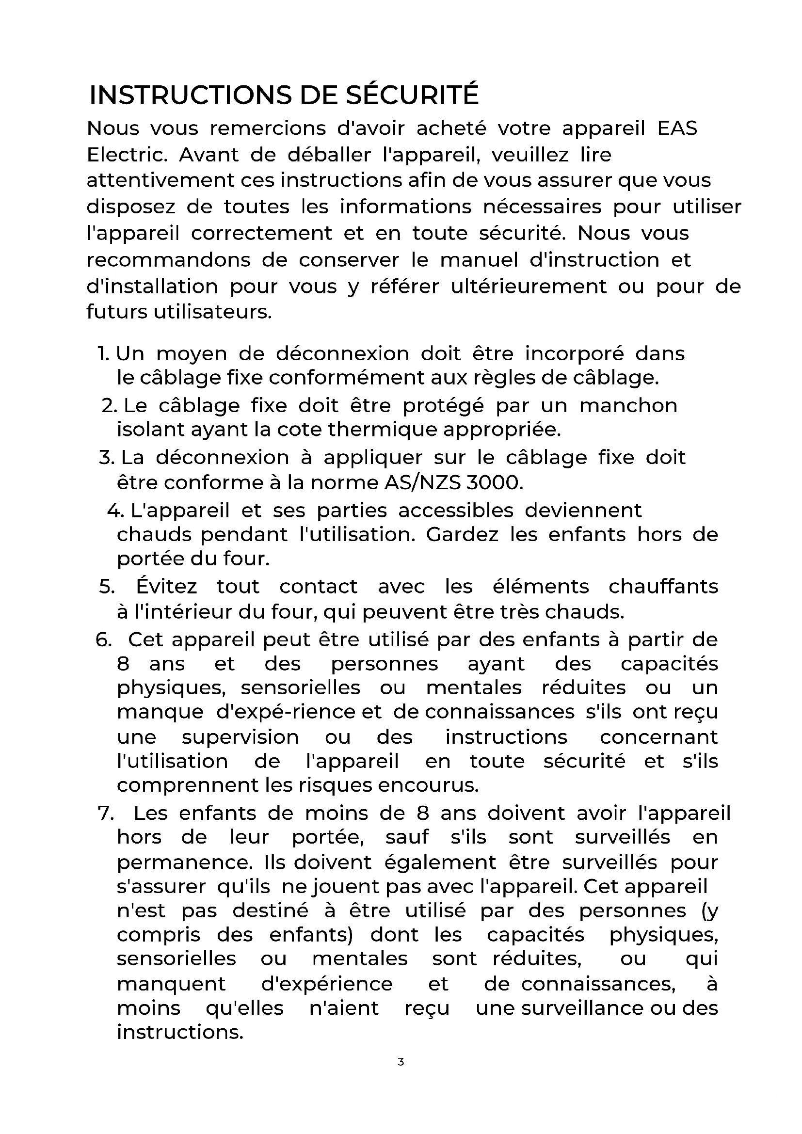 Nous vous remercions d'avoir acheté votre appareil EAS Electric. Avant de déballer l'appareil, veuillez lire attentivement ces instructions afin de vous assurer que vous disposez de toutes les informations nécessaires pour utiliser l'appareil correctement et en toute sécurité. Nous vous recommandons de conserver le manuel d'instruction et d'installation pour vous y référer ultérieurement ou pour de futurs utilisateurs.