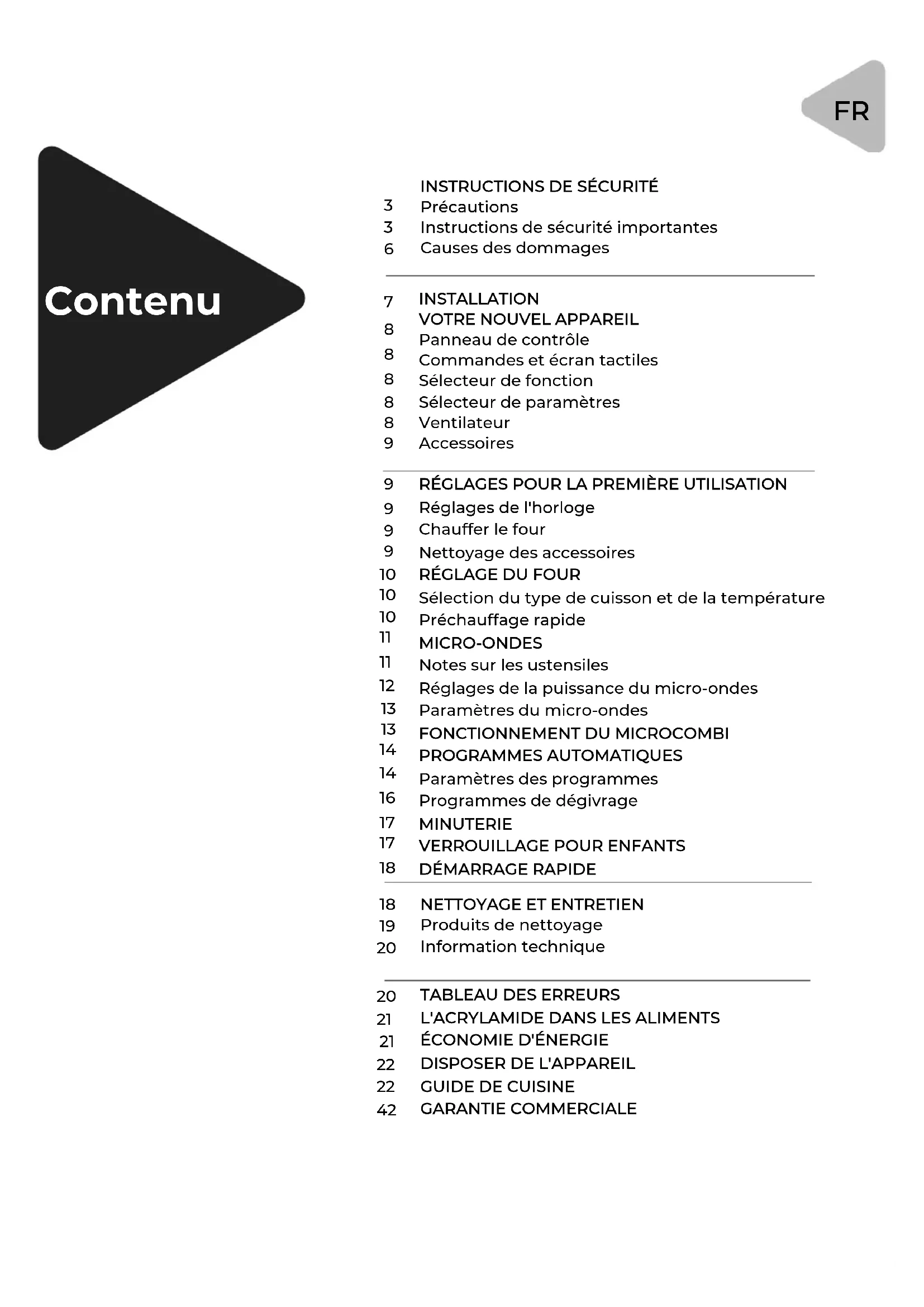 V.2Si votre four permet l'utilisation d'un thermomètre, utilisez uniquement celui qui est recommandé pour votre modèle. Les fours à micro-ondes ne doivent pas être encastrés ou placés dans une armoire, sauf s'ils ont été fabriqués et testés à cette fin. Dans ce cas, la porte décorative de l'armoire doit rester ouverte pendant le fonctionnement du four. Cet appareil est un appareil de table autoportant et n'est pas conçu pour être encastré. L'arrière de l'appareil doit être placé contre un mur. Cet appareil est destiné à être utilisé dans des environ- nements domestiques et similaires, tels que les cuisines du personnel dans les magasins, les bureaux et autres environ- nements de travail, dans les chalets, ou par les clients dans les hôtels, les motels et autres types d'hébergement rési- dentiel, tels que les chambres d'hôtes. Le four à micro-ondes est destiné à chauffer les aliments et les boissons. L'utilisation pour sécher des aliments ou des vêtements ou pour chauffer des coussins chauffants, des pantoufles ou des chaussettes, des gants de toilette humi- des ou d'autres articles peut entraîner un risque de blessure ou d'incendie. N'utilisez pas de récipients ou d'ustensiles en métal pour le chauffage par micro-ondes. Ne nettoyez pas l'appareil avec un nettoyeur à vapeur. N'utilisez pas de nettoyants abrasifs ou de grattoirs métalliques pour nettoyer le verre de la porte, car ils risquent de rayer la surface et de briser le verre.