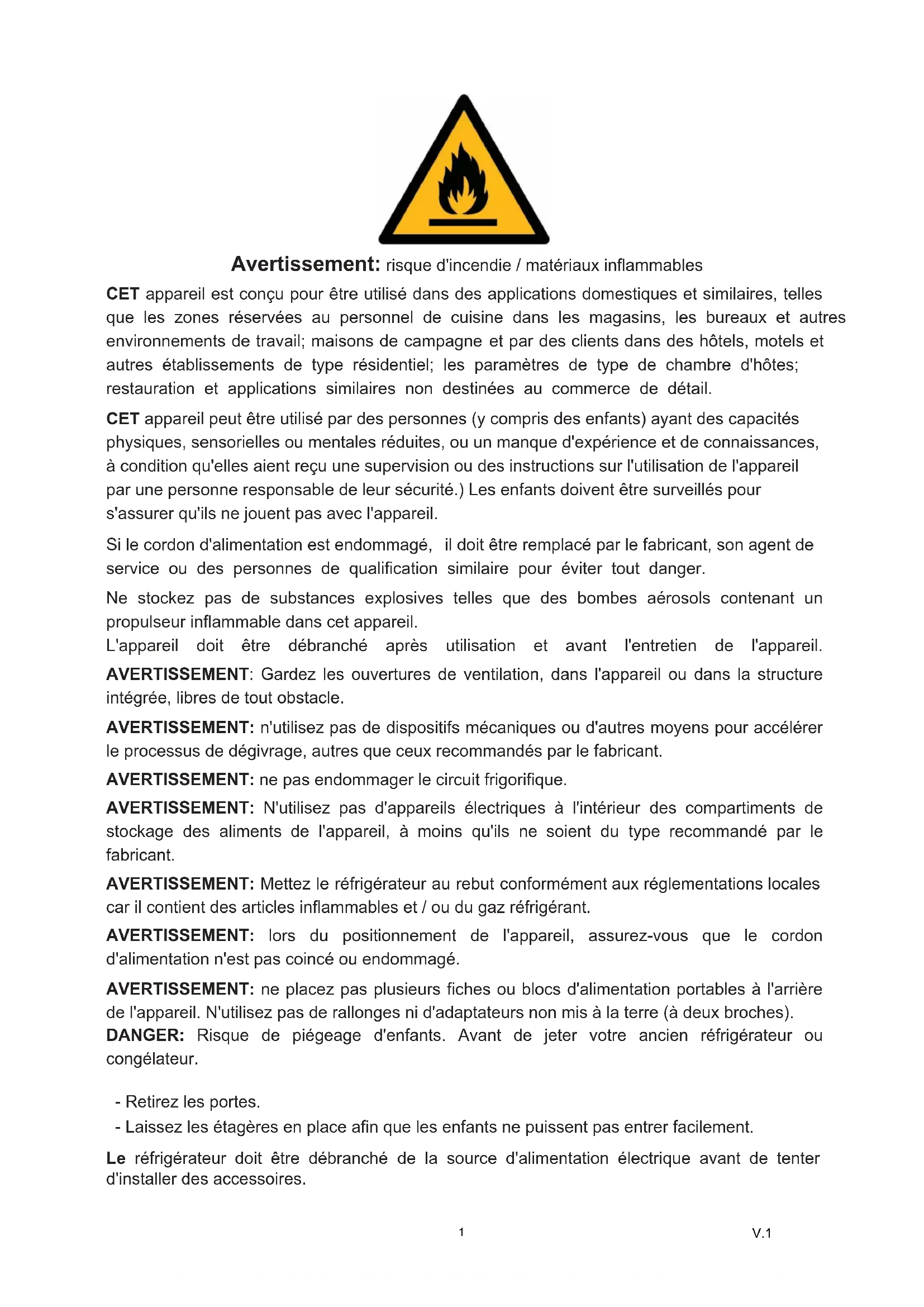 V.1Avertissement: risque d'incendie / matériaux inflammables CET appareil est conçu pour être utilisé dans des applications domestiques et similaires, telles que les zones réservées au personnel de cuisine dans les magasins, les bureaux et autres environnements de travail; maisons de campagne et par des clients dans des hôtels, motels et autres établissements de type résidentiel; les paramètres de type de chambre d'hôtes; restauration et applications similaires non destinées au commerce de détail. CET appareil peut être utilisé par des personnes (y compris des enfants) ayant des capacités physiques, sensorielles ou mentales réduites, ou un manque d'expérience et de connaissances, à condition qu'elles aient reçu une supervision ou des instructions sur l'utilisation de l'appareil par une personne responsable de leur sécurité.) Les enfants doivent être surveillés pour s'assurer qu'ils ne jouent pas avec l'appareil. Si le cordon d'alimentation est endommagé, il doit être remplacé par le fabricant, son agent de service ou des personnes de qualification similaire pour éviter tout danger. Ne stockez pas de substances explosives telles que des bombes aérosols contenant un propulseur inflammable dans cet appareil. L'appareil doit être débranché après utilisation et avant l'entretien de l'appareil.