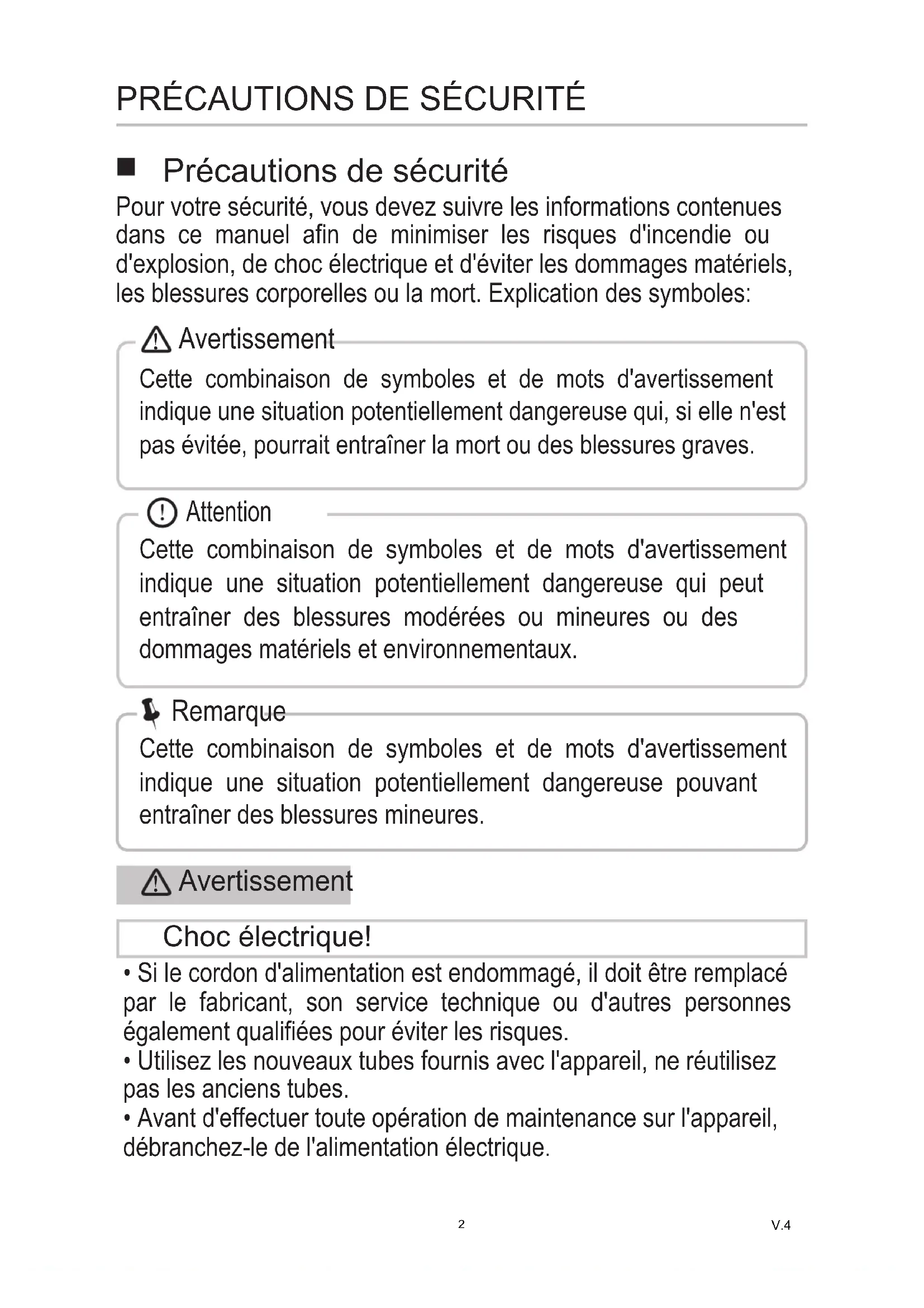 V.4• Si le cordon d'alimentation est endommagé, il doit être remplacé par le fabricant, son service technique ou d'autres personnes également qualifiées pour éviter les risques.