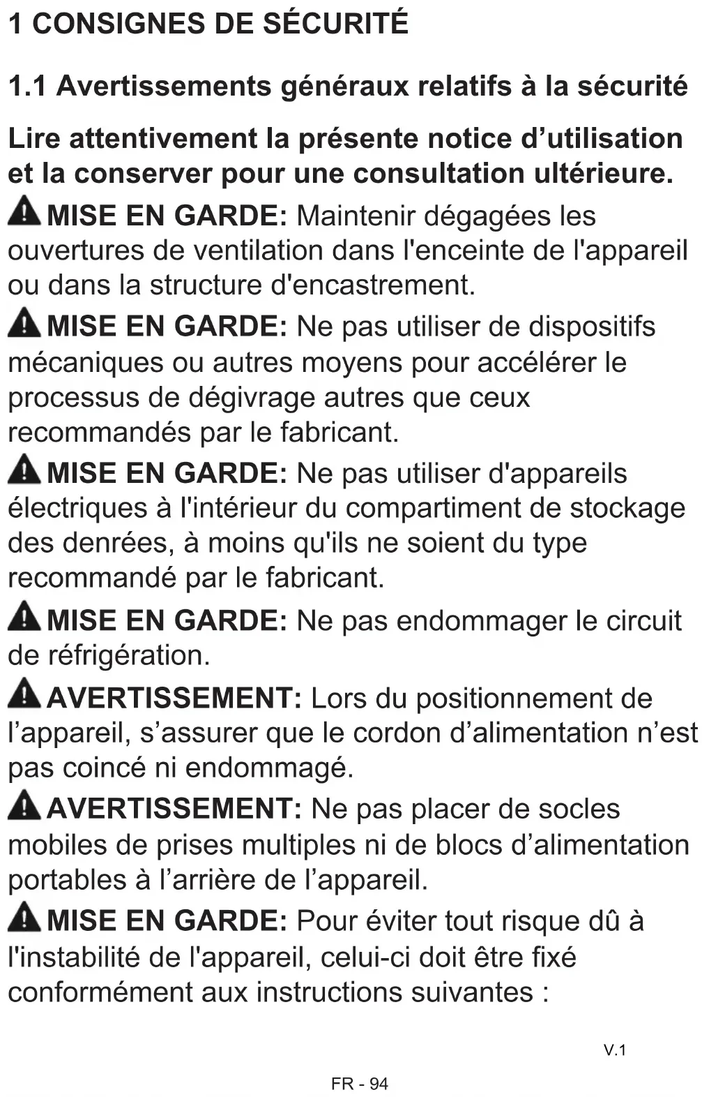 Lire attentivement la présente notice d’utilisation et la conserver pour une consultation ultérieure. MISE EN GARDE: Maintenir dégagées les ouvertures de ventilation dans l'enceinte de l'appareil ou dans la structure d'encastrement. MISE EN GARDE: Ne pas utiliser de dispositifs mécaniques ou autres moyens pour accélérer le processus de dégivrage autres que ceux recommandés par le fabricant. MISE EN GARDE: Ne pas utiliser d'appareils électriques à l'intérieur du compartiment de stockage des denrées, à moins qu'ils ne soient du type recommandé par le fabricant. MISE EN GARDE: Ne pas endommager le circuit de réfrigération.