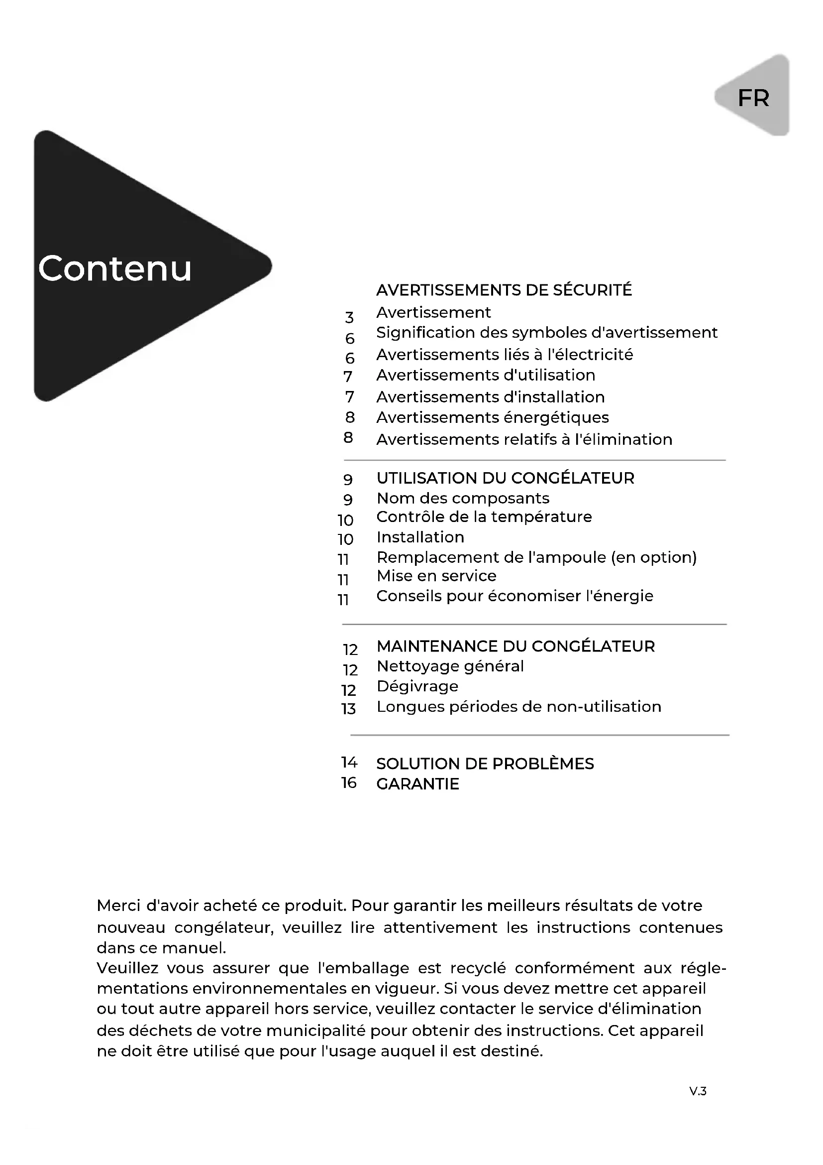 Merci d'avoir acheté ce produit. Pour garantir les meilleurs résultats de votre nouveau congélateur, veuillez lire attentivement les instructions contenues dans ce manuel. Veuillez vous assurer que l'emballage est recyclé conformément aux régle- mentations environnementales en vigueur. Si vous devez mettre cet appareil ou tout autre appareil hors service, veuillez contacter le service d'élimination des déchets de votre municipalité pour obtenir des instructions. Cet appareil ne doit être utilisé que pour l'usage auquel il est destiné. V.33 V.3
