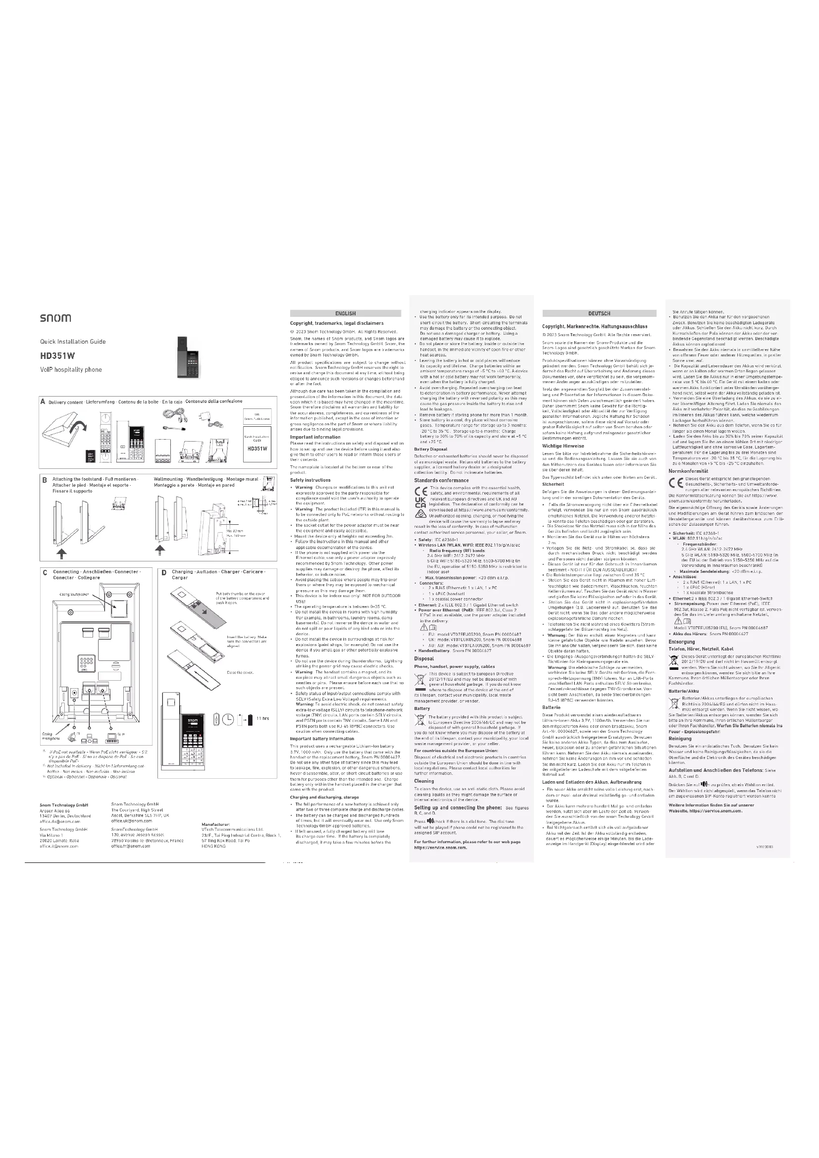 - Conectores: ◦ 2 x RJ45 (Ethernet): 1 x LAN, 1 x PC ◦ 1 x 4P4C (terminal) ◦ 1 x conector de alimentación coaxial• Ethernet: 2 x IEEE 802.3 / 1 Gigabit Ethernet switch• Power over Ethernet (PoE): IEEE 802.3at, Clase 2 Si PoE no está disponible, use el adaptador de corriente incluido en la caja. Modelo VT07EEU05200 (UE), VT07EEU05200, Snom PN 00004687• Batería del teléfono: Snom PN 00004627 Limpieza Use un paño antiestática. No utilice agua ni productos de limpieza, ya que podrían dañar la supercie o los compo-nentes electrónicos del aparato. Eliminación Teléfono, auricular, adaptador, cable Este teléfono está sujeto a la Directriz Europea 2012/19/EU, y no puede ser eliminado con los residuos domésticos generales. Si no sabe dónde puede desechar el dispositivo al nal de su vida útil, contacte con su municipio, su proveedor de gestión de residuos local, o su vendedor. Batería La batería está sujeto a la Directriz Europea 2006/66/EC, y no puede ser eliminado con los residuos domésticos generales. Si no sabe dónde puede desechar la batería al nal de su vida útil, contacte con su municipio, su proveedor de gestión de residuos local, o su vendedor. No ponga las baterías en el fuego ni en un incinerador. ¡RIESGO DE EXPLOSIÓN! Instalación y conexión del teléfono Ver las guras B, C y D. Pulse para comprobar si hay tono de marcación. El tono de marcación no se reproducirá si el teléfono no se pudo registrar en la cuenta SIP asignada.Para más información, consulte nuestra página web https://service.snom.com. FRANÇAIS Copyright, Marques Déposées, Non Respon- sabilitée © 2023 Snom Technology GmbH. Tous droits réservés. Snom, les noms des produits Snom et les logos Snom sont des marques déposées par Snom Technology GmbH.Toutes les spécications du produit sont sujet à modi-cations sans préavis. Snom Technology GmbH se ré-serve le droit de modier et de changer ce document à n‘importe quel moment, sans devoir annoncer de telles modications ou changements avant ou après leur mise en place. Bien que le plus grand soin ait été apporté à la compi-lation et à la présentation des informations contenues dans ce document, les données sur lesquelles elles sont basées peuvent entre-temps avoir été modiées. Snom doit donc décliner toute garantie et toute responsabilité quand à l‘exactitude et à l‘exhaustivité des informations publiées excepté en cas de négligence agrante de la part de Snom ainsi que des les cas ou la responsabilité de Snom est engagée de par la loi. Informations importantes Veuillez lire les informations concernant la sécurité et la mise au rebut de l‘appareil ainsi que celles concernant son installation et son utilisation avant d‘utiliser l‘appareil. Communiquez également ces informations aux autres uti-lisateurs.La plaque signalétique est située en bas ou à l'arrière du produit. Sécurité Suivez les instructions présentes dans ce manuel et dans les autres documents concernant l‘appareil.• Evitez de placer les câbles de l’appareil dans un endroit ou il est possible de trébucher dessus. Evitez égale-ment de les placer là ou ils pourraient être exposé à un écrasement car ils pourraient en être endommagé. Si les câbles ou la che sont endommagés, débranchez l’appareil et contactez du personnel d’entretien qualié.