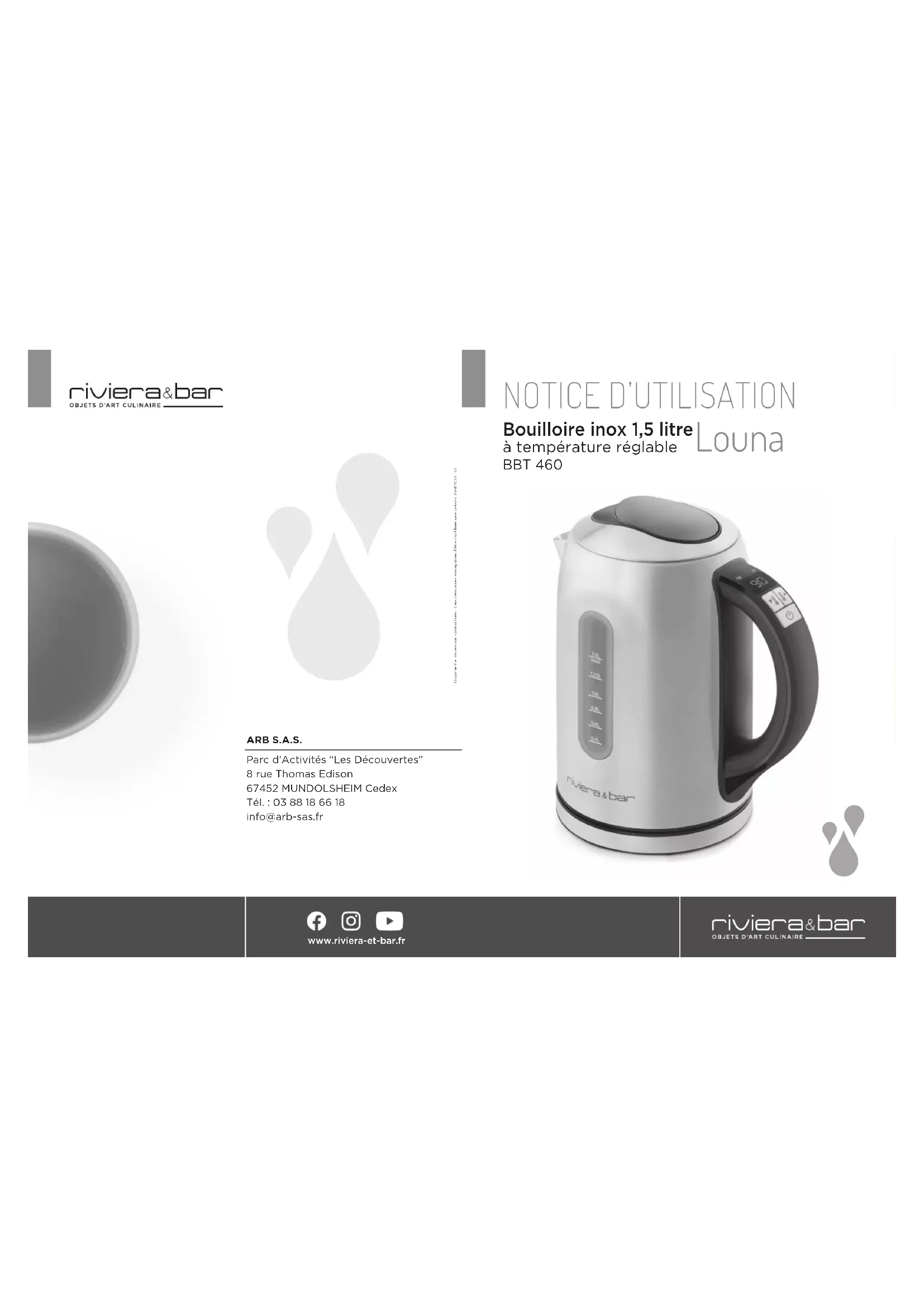 notice d’utilisation ARB S.A.S.Parc d’Activités “Les Découvertes”8 rue Thomas Edison67452 MUNDOLSHEIM CedexTél. : 03 88 18 66 18info@arb-sas.frwww.riviera-et-bar.fr Bouilloire inox 1,5 litre à température réglable BBT 460