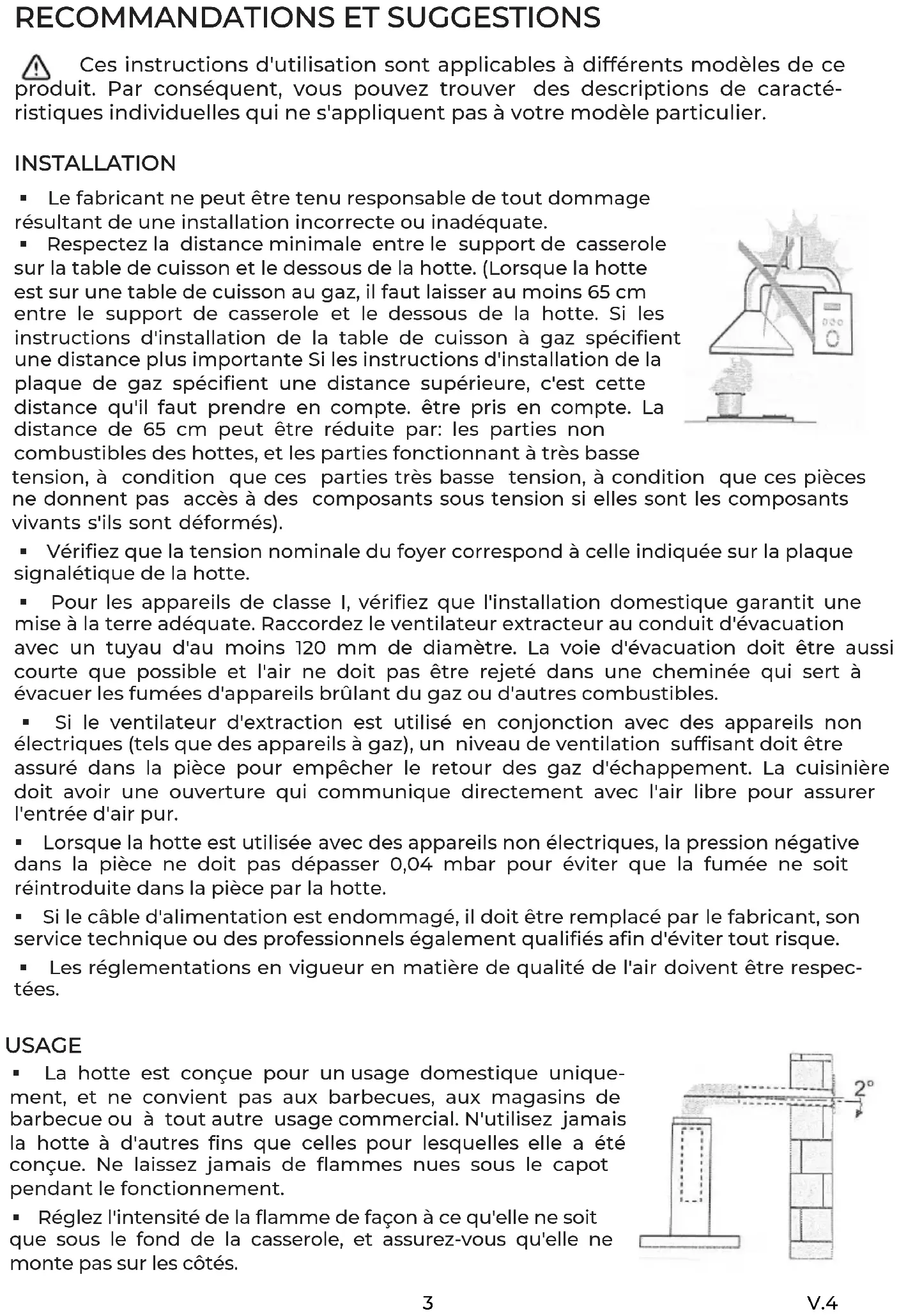 Le fabricant ne peut être tenu responsable de tout dommage résultant de une installation incorrecte ou inadéquate. Respectez la distance minimale entre le support de casserole sur la table de cuisson et le dessous de la hotte. (Lorsque la hotte est sur une table de cuisson au gaz, il faut laisser au moins 65 cm entre le support de casserole et le dessous de la hotte. Si les instructions d'installation de la table de cuisson à gaz spécifient une distance plus importante Si les instructions d'installation de la plaque de gaz spécifient une distance supérieure, c'est cette distance qu'il faut prendre en compte. être pris en compte. La distance de 65 cm peut être réduite par: les parties non combustibles des hottes, et les parties fonctionnant à très basse tension, à condition que ces parties très basse tension, à condition que ces pièces ne donnent pas accès à des composants sous tension si elles sont les composants vivants s'ils sont déformés). Vérifiez que la tension nominale du foyer correspond à celle indiquée sur la plaque signalétique de la hotte. Pour les appareils de classe I, vérifiez que l'installation domestique garantit une mise à la terre adéquate. Raccordez le ventilateur extracteur au conduit d'évacuation avec un tuyau d'au moins 120 mm de diamètre. La voie d'évacuation doit être aussi courte que possible et l'air ne doit pas être rejeté dans une cheminée qui sert à évacuer les fumées d'appareils brûlant du gaz ou d'autres combustibles. Si le ventilateur d'extraction est utilisé en conjonction avec des appareils non électriques (tels que des appareils à gaz), un niveau de ventilation suffisant doit être assuré dans la pièce pour empêcher le retour des gaz d'échappement. La cuisinière doit avoir une ouverture qui communique directement avec l'air libre pour assurer l'entrée d'air pur. Lorsque la hotte est utilisée avec des appareils non électriques, la pression négative dans la pièce ne doit pas dépasser 0,04 mbar pour éviter que la fumée ne soit réintroduite dans la pièce par la hotte. Si le câble d'alimentation est endommagé, il doit être remplacé par le fabricant, son service technique ou des professionnels également qualifiés afin d'éviter tout risque. Les réglementations en vigueur en matière de qualité de l'air doivent être respec- tées. USAGE La hotte est conçue pour un usage domestique unique- ment, et ne convient pas aux barbecues, aux magasins de barbecue ou à tout autre usage commercial. N'utilisez jamais la hotte à d'autres fins que celles pour lesquelles elle a été conçue. Ne laissez jamais de flammes nues sous le capot pendant le fonctionnement. Réglez l'intensité de la flamme de façon à ce qu'elle ne soit que sous le fond de la casserole, et assurez-vous qu'elle ne monte pas sur les côtés.