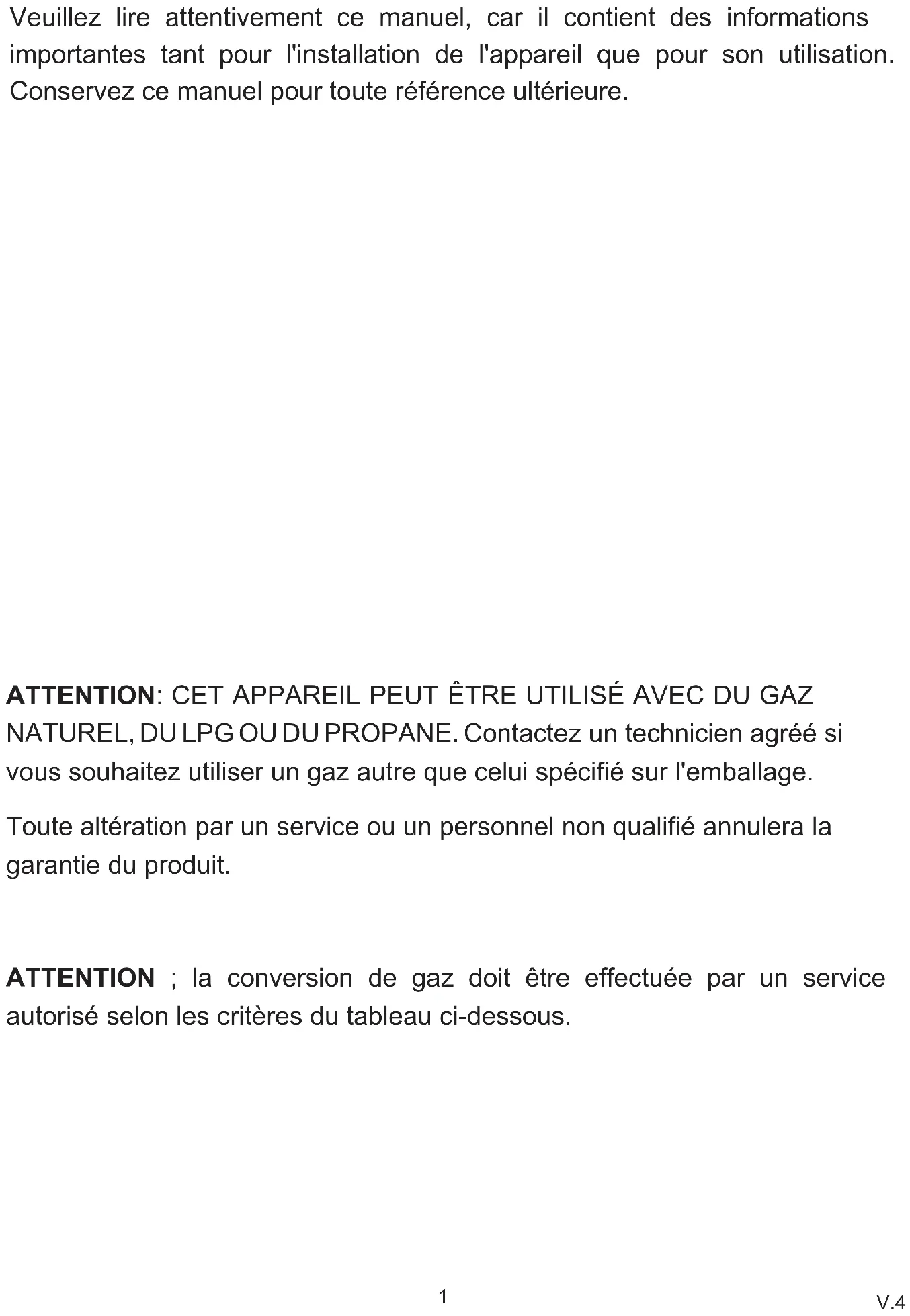 94Veuillez lire attentivement ce manuel, car il contient des informations importantes tant pour l'installation de l'appareil que pour son utilisation. Conservez ce manuel pour toute référence ultérieure. ATTENTION: CET APPAREIL PEUT ÊTRE UTILISÉ AVEC DU GAZ NATUREL, DU LPG OU DU PROPANE. Contactez un technicien agréé si vous souhaitez utiliser un gaz autre que celui spécifié sur l'emballage. Toute altération par un service ou un personnel non qualifié annulera la garantie du produit. ATTENTION ; la conversion de gaz doit être effectuée par un service autorisé selon les critères du tableau ci-dessous.