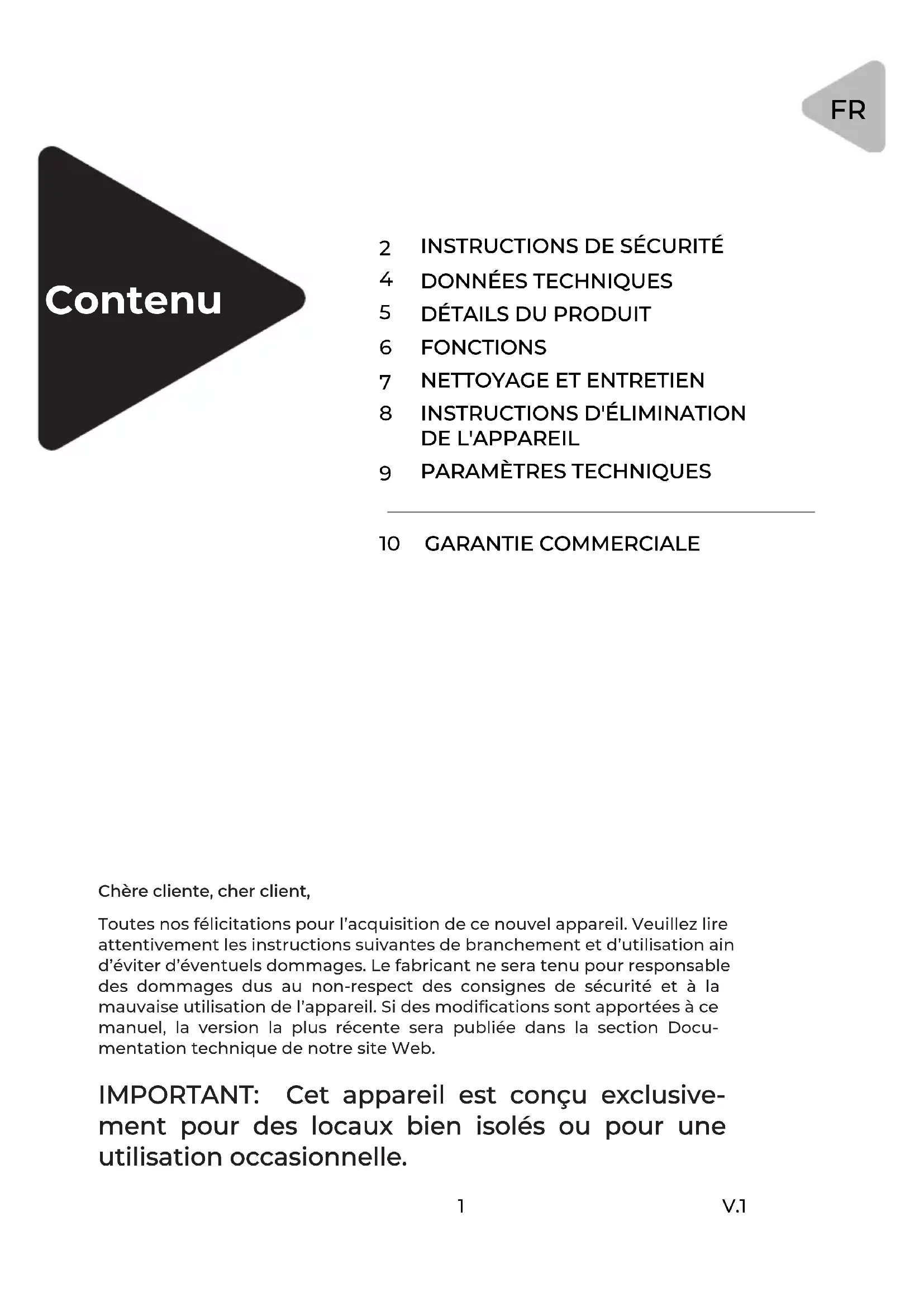 Chère cliente, cher client,Toutes nos félicitations pour l’acquisition de ce nouvel appareil. Veuillez lire attentivement les instructions suivantes de branchement et d’utilisation ain d’éviter d’éventuels dommages. Le fabricant ne sera tenu pour responsable des dommages dus au non-respect des consignes de sécurité et à la mauvaise utilisation de l’appareil. Si des modifications sont apportées à ce manuel, la version la plus récente sera publiée dans la section Docu-mentation technique de notre site Web. IMPORTANT: Cet appareil est conçu exclusive- ment pour des locaux bien isolés ou pour une utilisation occasionnelle.