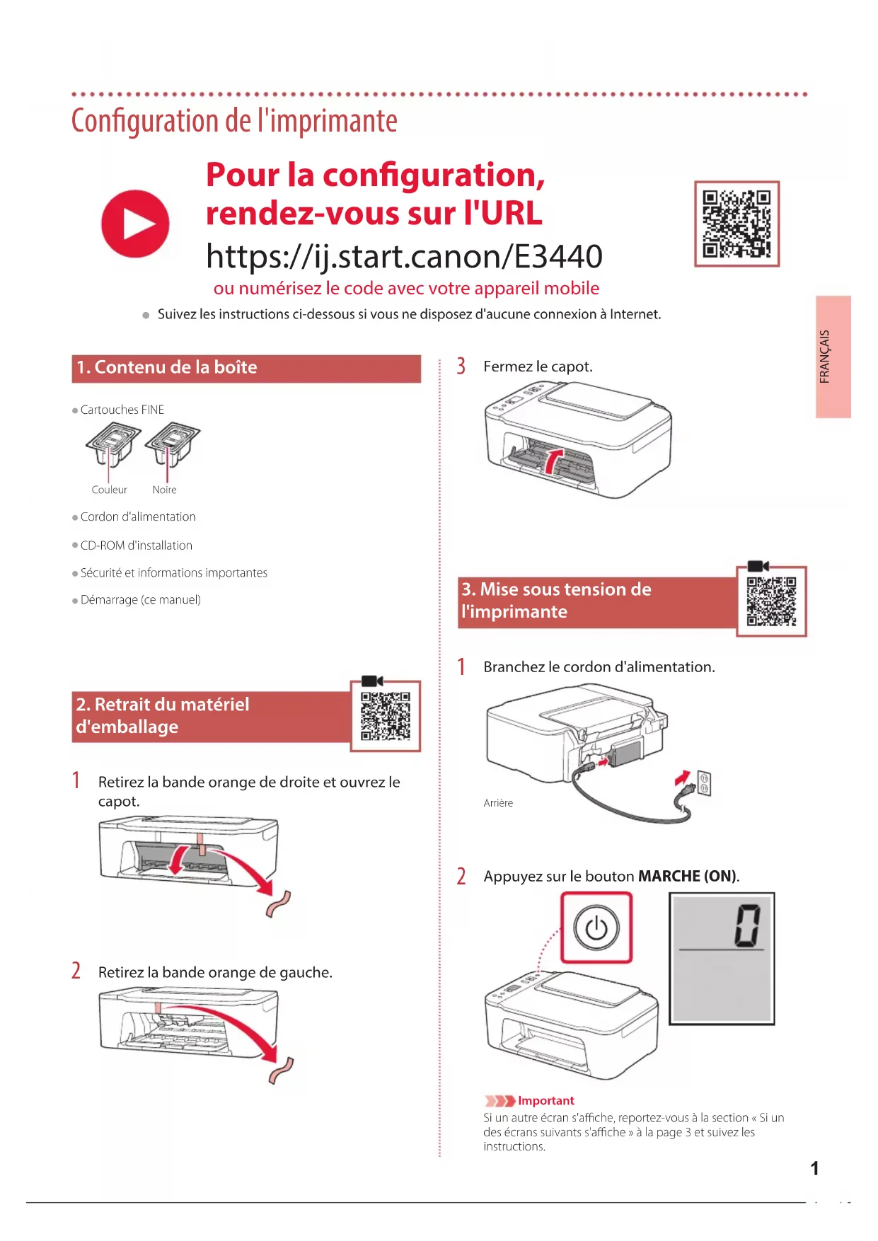 Appuyez sur le bouton MARCHE (ON). ImportantSi un autre écran s'ache, reportez-vous à la section «Si un des écrans suivants s'ache» à la page 3 et suivez les instructions. Pour la conguration, rendez-vous sur l'URL https://ij.start.canon/E3440 ou numérisez le code avec votre appareil mobile