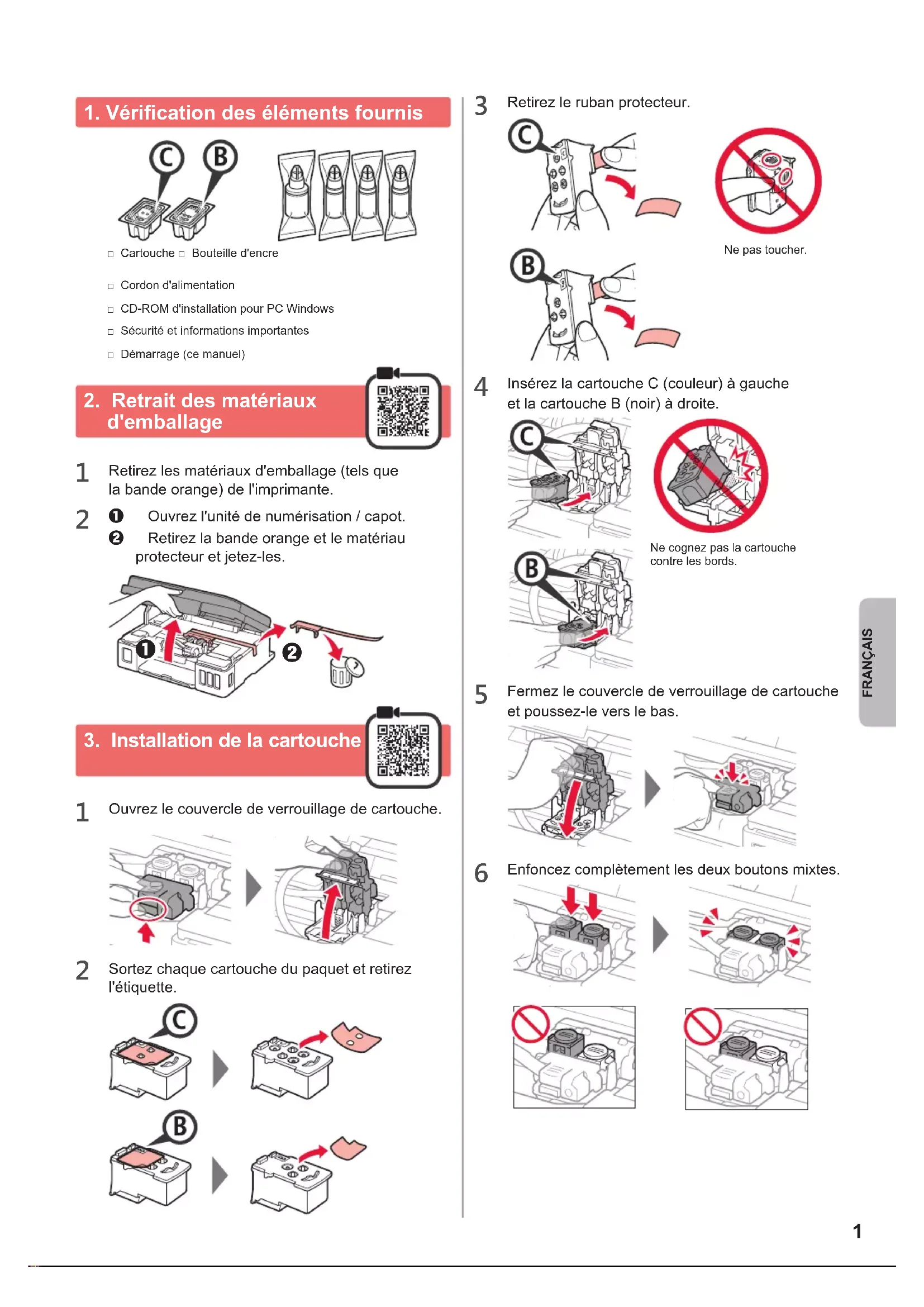 □ Sécurité et informations importantes □ Cordon d'alimentation □ CD-ROM d'installation pour PC Windows □ Démarrage )ce manuel( □ Cartouche □ Bouteille d'encre