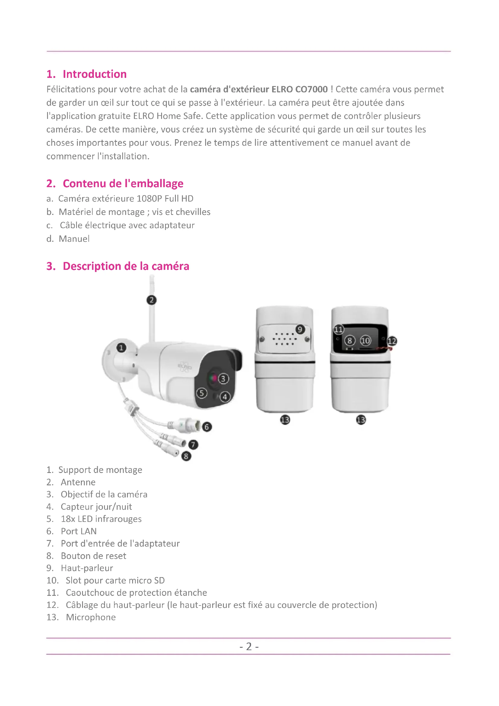 Félicitations pour votre achat de la caméra d'extérieur ELRO CO7000 ! Cette caméra vous permet de garder un œil sur tout ce qui se passe à l'extérieur. La caméra peut être ajoutée dans l'application gratuite ELRO Home Safe. Cette application vous permet de contrôler plusieurs caméras. De cette manière, vous créez un système de sécurité qui garde un œil sur toutes les choses importantes pour vous. Prenez le temps de lire attentivement ce manuel avant de commencer l'installation.