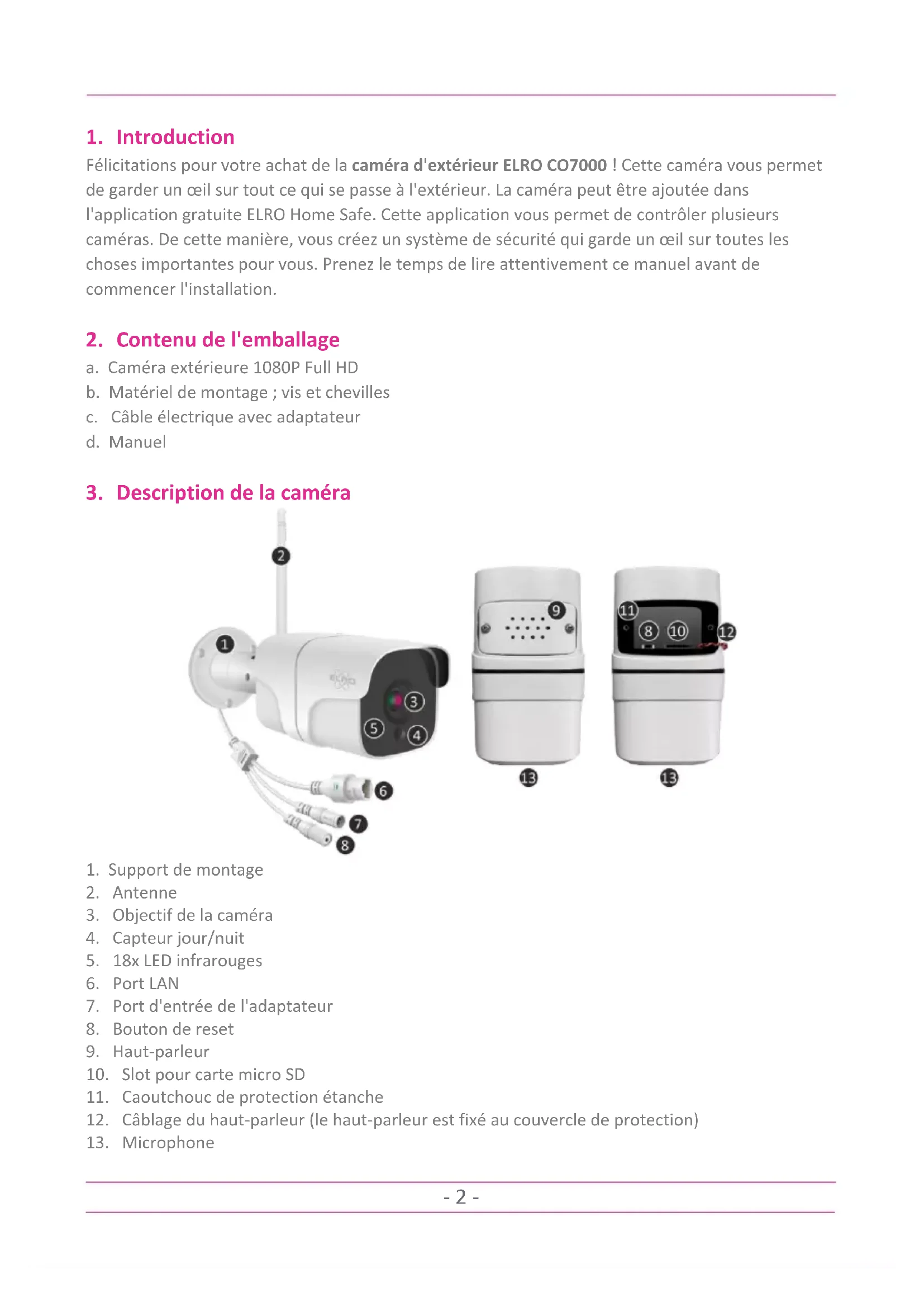 Félicitations pour votre achat de la caméra d'extérieur ELRO CO7000 ! Cette caméra vous permet de garder un œil sur tout ce qui se passe à l'extérieur. La caméra peut être ajoutée dans l'application gratuite ELRO Home Safe. Cette application vous permet de contrôler plusieurs caméras. De cette manière, vous créez un système de sécurité qui garde un œil sur toutes les choses importantes pour vous. Prenez le temps de lire attentivement ce manuel avant de commencer l'installation.