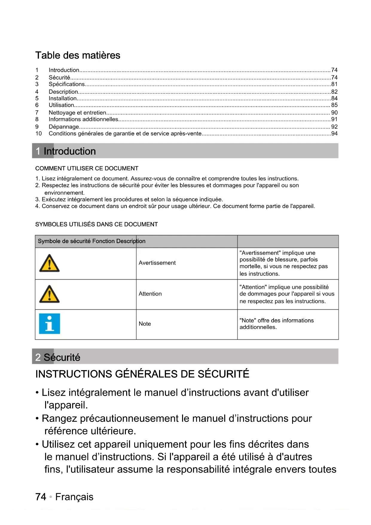 Symbole de sécurité Fonction Description Avertissement "Avertissement" implique une possibilité de blessure, parfois mortelle, si vous ne respectez pas les instructions. Attention "Attention" implique une possibilité de dommages pour l'appareil si vous ne respectez pas les instructions. Note "Note" offre des informations additionnelles. 2 Sécurité INSTRUCTIONS GÉNÉRALES DE SÉCURITÉ