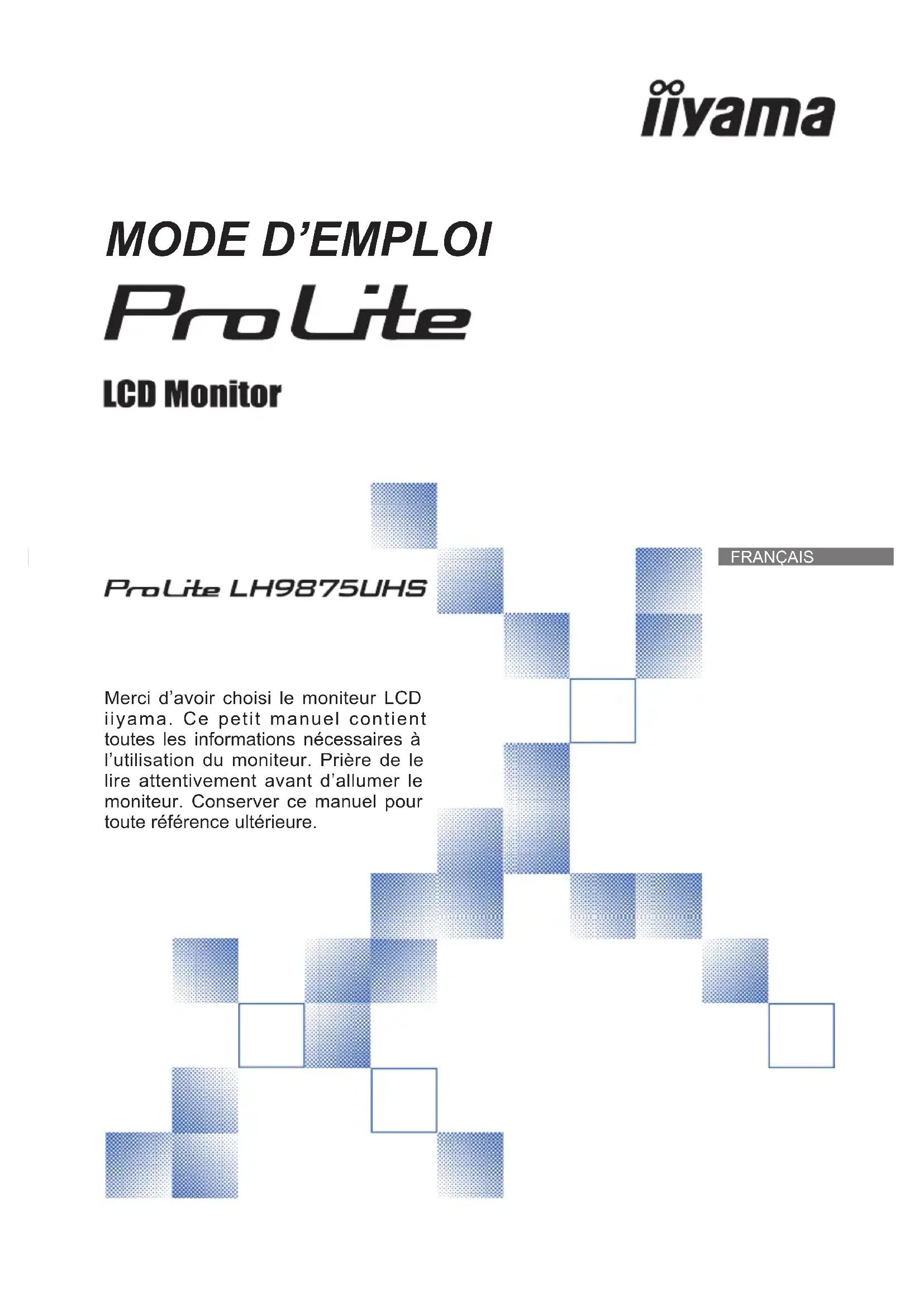 Merci d’avoir choisi le moniteur LCD iiyama. Ce petit manuel contient toutes les informations nécessaires à l’utilisation du moniteur. Prière de le lire attentivement avant d’allumer le moniteur. Conserver ce manuel pour toute référence ultérieure.FRANÇAIS