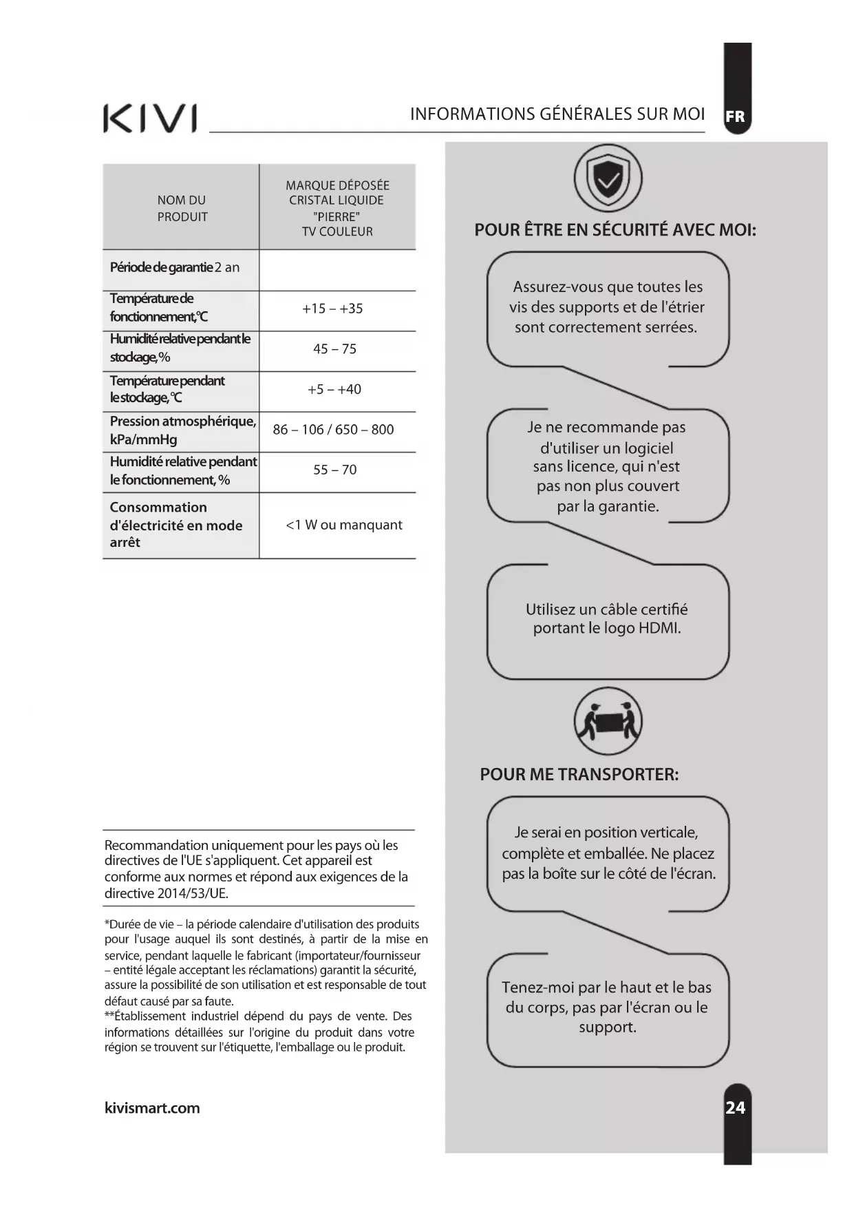 *Durée de vie – la période calendaire d'utilisation des produits pour l'usage auquel ils sont destinés, à partir de la mise en service, pendant laquelle le fabricant (importateur/fournisseur – entité légale acceptant les réclamations) garantit la sécurité, assure la possibilité de son utilisation et est responsable de tout défaut causé par sa faute. **Établissement industriel dépend du pays de vente. Des informations détaillées sur l'origine du produit dans votre région se trouvent sur l'étiquette, l'emballage ou le produit. Recommandation uniquement pour les pays où les directives de l'UE s'appliquent. Cet appareil est conforme aux normes et répond aux exigences de la directive 2014/53/UE. POUR ME TRANSPORTER: Je serai en position verticale, complète et emballée. Ne placez pas la boîte sur le côté de l'écran. Tenez-moi par le haut et le bas du corps, pas par l'écran ou le support. Utilisez un câble certifié portant le logo HDMI. Je ne recommande pas d'utiliser un logiciel sans licence, qui n'est pas non plus couvert par la garantie. Assurez-vous que toutes les vis des supports et de l'étrier sont correctement serrées. POUR ÊTRE EN SÉCURITÉ AVEC MOI: NOM DU PRODUIT