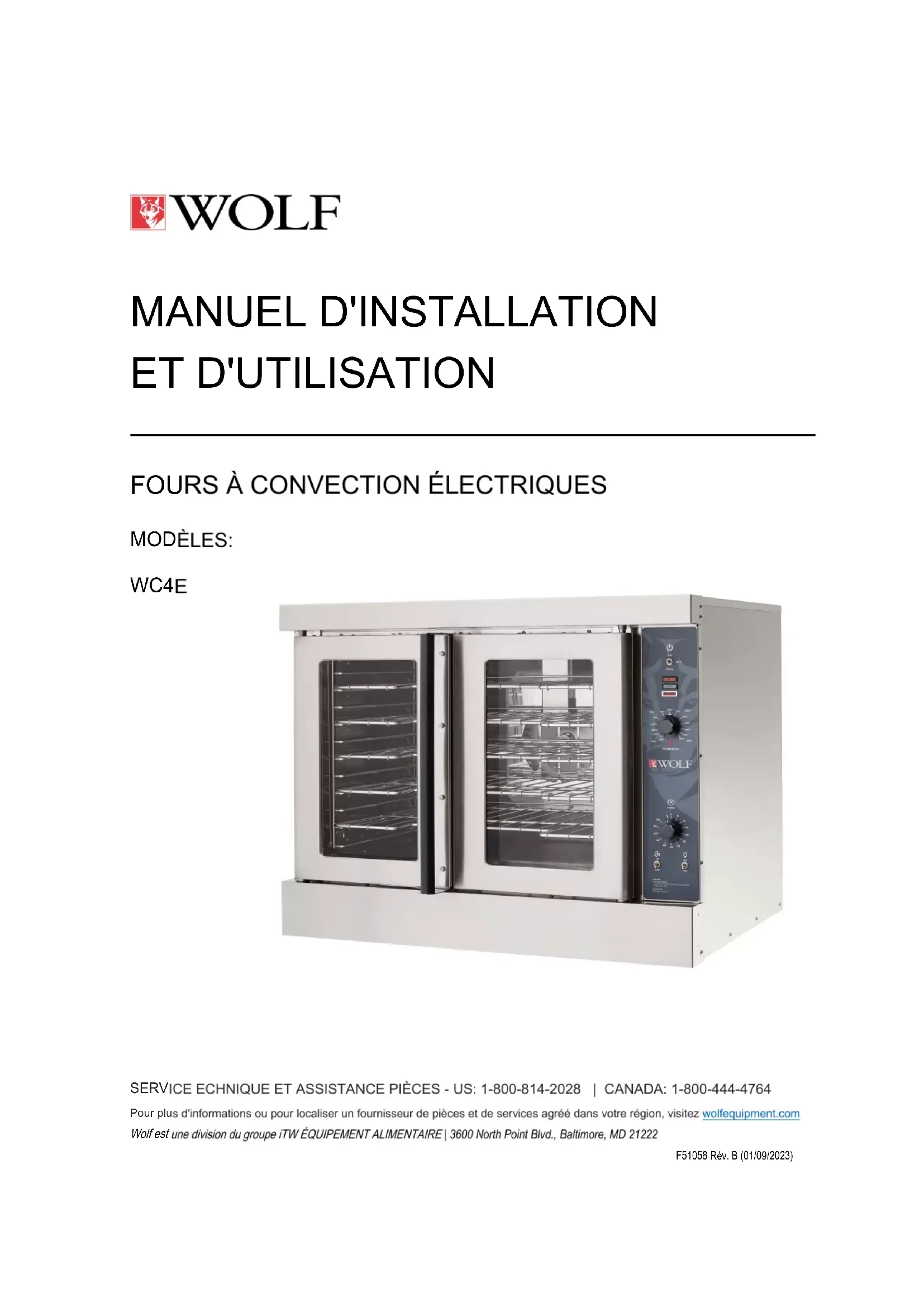 Excessive shrinkage. Product pulling to edge of pan or spillingSERVICE ECHNIQUE ET ASSISTANCE PIÈCES - US: 1-800-814-2028 | CANADA: 1-800-444-4764 Pour plus d'informations ou pour localiser un fournisseur de pièces et de services agréé dans votre région, visitez wolfequipment.com Wolf est une division du groupe iTW ÉQUIPEMENT ALIMENTAIRE | 3600 North Point Blvd., Baltimore, MD 21222 F51058 Rév. B (01/09/2023) MANUEL D'INSTALLATION ET D'UTILISATION