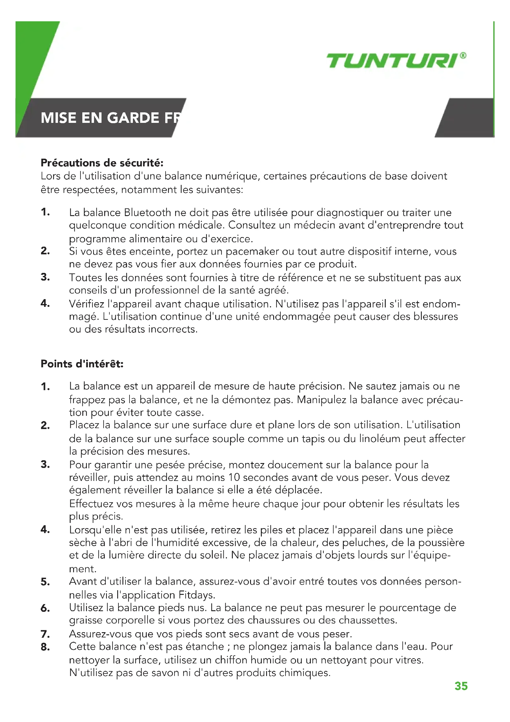 Merci d'avoir choisi la Tunturi Smart Scale ! Cette balance est votre assistant personnel de santé. Elle utilise la technologie d'analyse d'impédance bioélectrique (BIA) pour vous offrir les données dont vous avez besoin pour suivre vos mesures de santé personnelles : IMC (Indice de Masse Corporelle), pourcentage de graisse corporelle, taux d'hydratati- on corporelle, masse musculaire, masse osseuse, protéines et bien plus encore ! Remarque: Le poids maximum de l'utilisateur est de 180 kg.