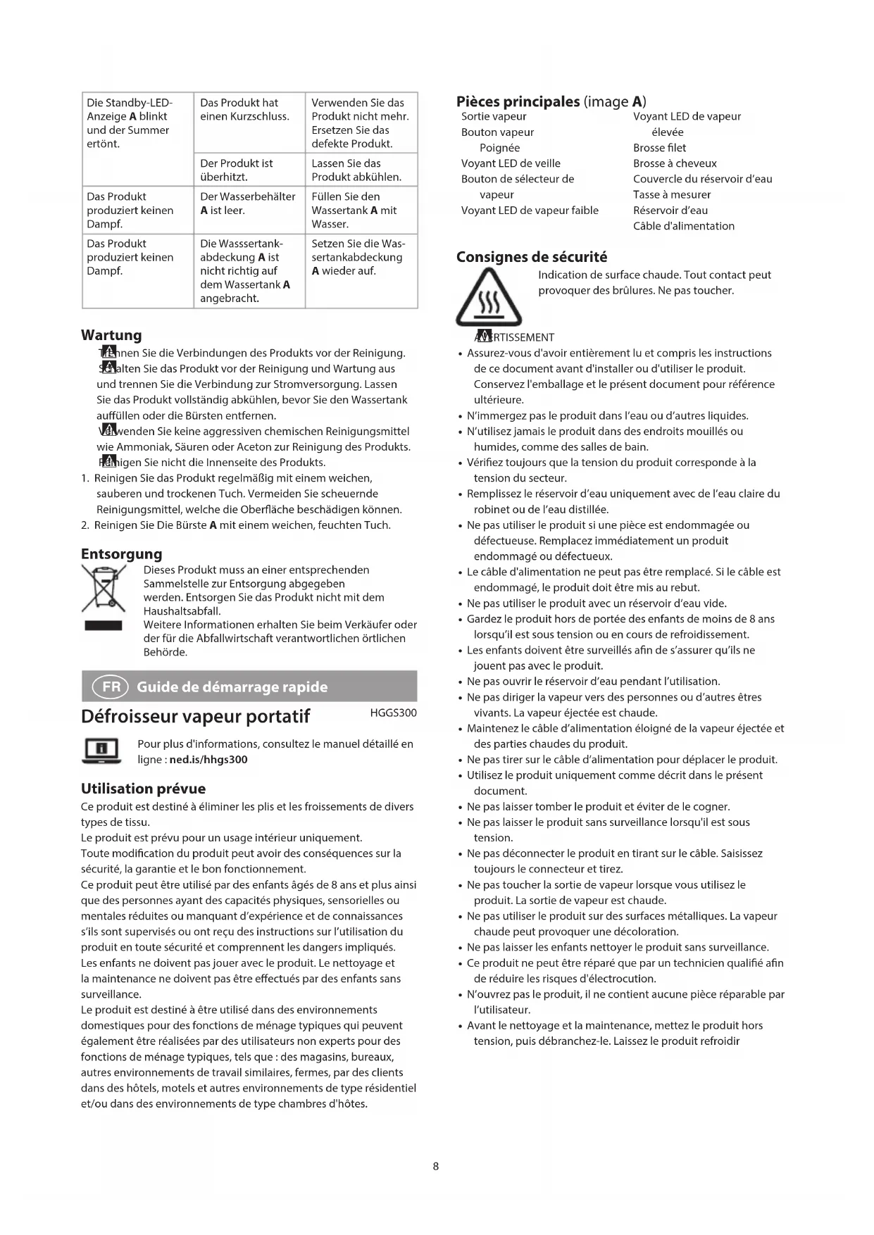 Guide de démarrage rapide Défroisseur vapeur portatif HGGS300 Pour plus d'informations, consultez le manuel détaillé en ligne : ned.is/hhgs300 Utilisation prévue Ce produit est destiné à éliminer les plis et les froissements de divers types de tissu. Le produit est prévu pour un usage intérieur uniquement. Toute modication du produit peut avoir des conséquences sur la sécurité, la garantie et le bon fonctionnement. Ce produit peut être utilisé par des enfants âgés de 8 ans et plus ainsi que des personnes ayant des capacités physiques, sensorielles ou mentales réduites ou manquant d’expérience et de connaissances s’ils sont supervisés ou ont reçu des instructions sur l’utilisation du produit en toute sécurité et comprennent les dangers impliqués. Les enfants ne doivent pas jouer avec le produit. Le nettoyage et la maintenance ne doivent pas être eectués par des enfants sans surveillance. Le produit est destiné à être utilisé dans des environnements domestiques pour des fonctions de ménage typiques qui peuvent également être réalisées par des utilisateurs non experts pour des fonctions de ménage typiques, tels que : des magasins, bureaux, autres environnements de travail similaires, fermes, par des clients dans des hôtels, motels et autres environnements de type résidentiel et/ou dans des environnements de type chambres d'hôtes.9 Le voyant LED de veille A clignote et la sonnerie retentit.Le produit a été court-circuité.Ne plus utiliser le produit. Remplacez le produit défectueux.Le produit est en surchaue.Laissez le produit refroidir.Le produit ne génère pas de vapeur.Le réservoir d’eau A est vide.Remplissez le réservoir d’eau A avec de l’eau.Le produit ne génère pas de vapeur.Le couvercle du réservoir d’eau A n’est pas placé correctement sur le réservoir d’eau A.Remettez le couvercle du réservoir d’eau A. Maintenance