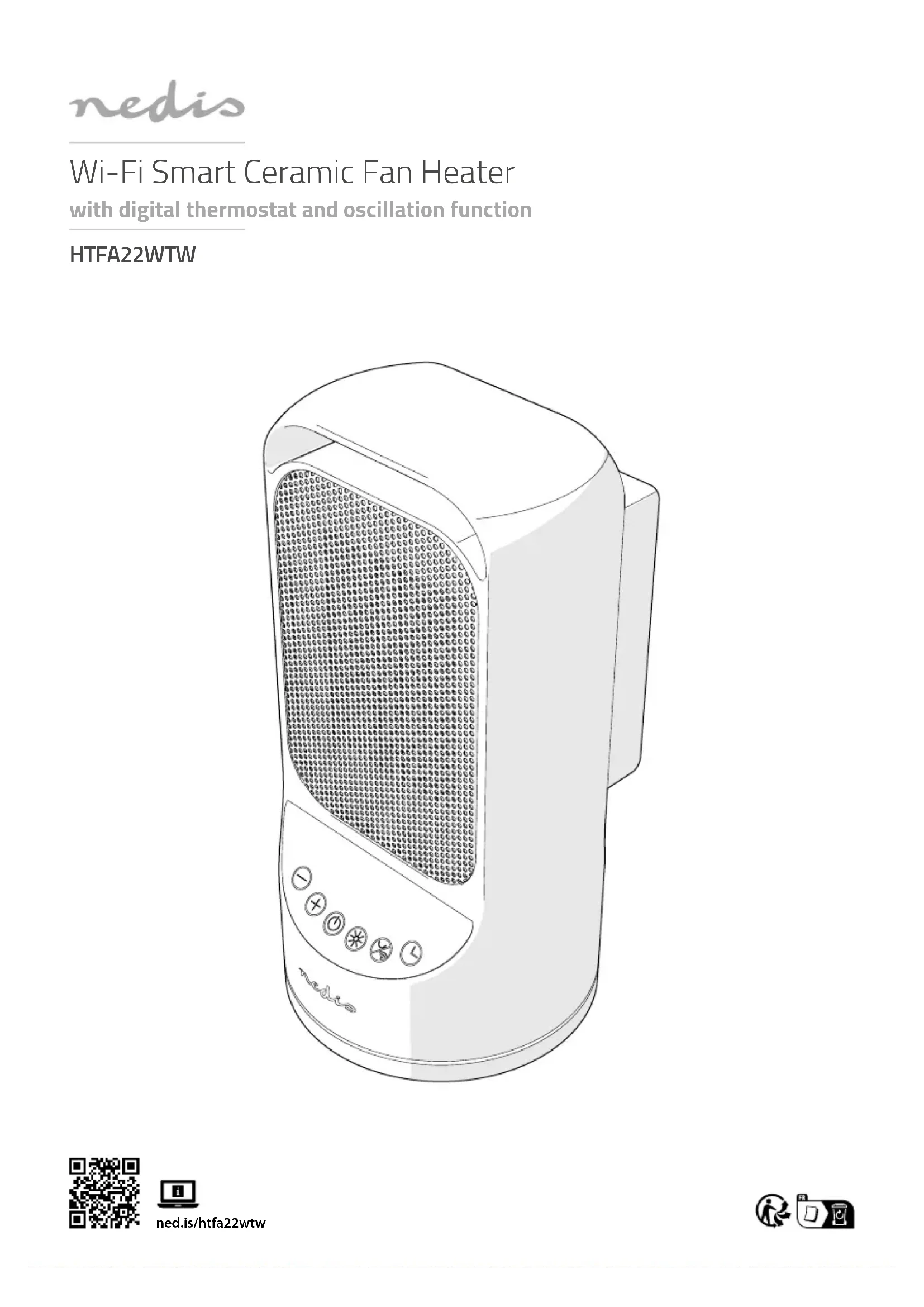 Guide de démarrage rapide Radiateur céramique souant intelligent Wi-Fi HTFA22WTWPour plus d'informations, consultez le manuel détaillé en ligne : ned.is/htfa22wtw Utilisation prévue Ce produit est un radiateur qui permet à l’utilisateur de contrôler la température ambiante.Ce produit peut être contrôlé via l’application Nedis SmartLife, les boutons du produit ou la télécommande incluse.Ce produit ne peut être utilisé que dans des locaux bien isolés ou de manière occasionnelle.Le produit est prévu pour un usage intérieur uniquement.Le produit est destiné à être utilisé dans des environnements domestiques pour des fonctions de ménage typiques qui peuvent également être réalisées par des utilisateurs non experts pour des fonctions de ménage typiques, tels que : des magasins, bureaux, autres environnements de travail similaires, fermes, par des clients dans des hôtels, motels et autres environnements de type résidentiel et/ou dans des environnements de type chambres d'hôtes.Ce produit n'est pas destiné à être utilisé par des personnes (y compris des enfants) ayant des capacités physiques, sensorielles ou mentales réduites ou manquant d'expérience et de connaissances, sauf si elles ont reçu une supervision ou des instructions concernant l'utilisation du produit par une personne responsable de leur sécurité.Toute modication du produit peut avoir des conséquences sur la sécurité, la garantie et le bon fonctionnement. Pièces principales (image A) 1 Poignée 2 Sortie d’air 3 Achage 4 Bouton de diminution de la température 5 Bouton d’augmentation de la température 6 Bouton marche/veille 7 Bouton mode 8 Bouton oscillation/Wi-Fi 9 Bouton de minuterie q Entrée d'air w Interrupteur marche/arrêt e Bouton d'oscillation r Câble d'alimentation Consignes de sécurité Pour éviter toute surchaue, ne couvrez pas le produit. AVERTISSEMENT• Assurez-vous d'avoir entièrement lu et compris les instructions de ce document avant d'installer ou d'utiliser le produit. Conservez l'emballage et le présent document pour référence ultérieure.• Ne pas laisser tomber le produit et éviter de le cogner.• Gardez toujours les piles bouton, chargées et déchargées, hors de portée des enfants an d’éviter tout risque d’ingestion. Jetez les piles usagées immédiatement et en toute sécurité. Si elles sont avalées, les piles bouton peuvent provoquer de graves brûlures chimiques internes en seulement deux heures. Gardez à l'esprit que les premiers symptômes peuvent ressembler à des maladies infantiles comme la toux ou la bave. Si vous pensez que des piles ont été avalées, consultez immédiatement un médecin.• Essuyez les bornes de la batterie avec un chion propre et sec si elles sont sales.• Les piles non rechargeables ne doivent pas être rechargées.• Ne pas court-circuiter une batterie.10 4 Température ambiante actuelle 5 Voyant Wi-Fi 6 Indicateur de minuterie 7 Indicateur d’unité Basculer entre les paramètres d'alimentation