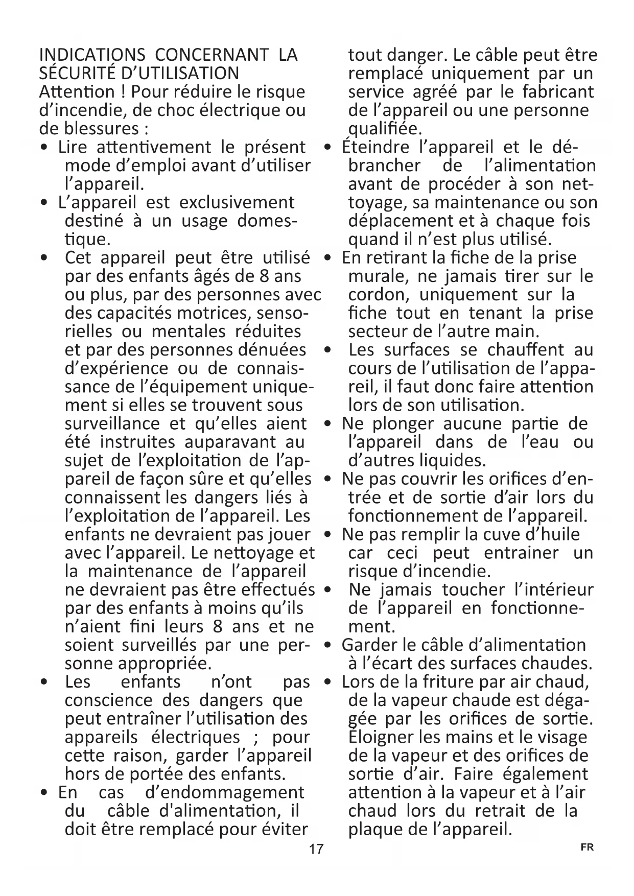 Débrancher l’appareil de la prise, rerer le roir avec le panier, les placer sur une surface plane résistant aux températures élevées et ensuite, sorr les aliments à l’aide d’un ustensile adapté. Aenon ! - Si le roir avec le panier n’est pas bien inséré, l’appareil ne se met- tra pas en marche. Insérer le roir jusqu’au bout pour désacver la protecon contre la marche sans panier. L’appareil dispose d’une foncon de mémoire de deux heures, en cas de panne de courant. Après avoir sor le roir avec le panier et après avoir agité les ali- ments, insérer complètement le roir dans l’appareil qui se remera en marche connuera la cuisson des produits. - Faire aenon pour éviter les brûlures causées par la vapeur ou le basculement du panier de friture, ce qui peut entrainer des brûlures causées par l’huile déversée ou les aliments chauds. De plus, nous suggérons l’ulisaon d’ustensiles adaptés pour sorr les aliments préparés. - Lors de la première ulisaon une fumée blanche ou une odeur désagréable peuvent se dégager. C’est un phénomène normal qui ne doit pas vous inquiéter. - L’épaisseur ou la densité des aliments, le degré de décongélaon des aliments peuvent avoir un impact sur la durée totale de cuisson. La cuisson de quantés plus petes raccourcit le temps de travail de l’appareil. - Faire aenon en retournant les aliments dans le récipient inté- rieur. Pour éviter les blessures et les dommages matériels, ne pas retourner les aliments en secouant tout l’appareil. - Une fois le travail terminé, ne jamais poser le roir du panier sur une surface sensible à la chaleur. Toujours placer le roir sur un sup- port ou une surface qui protège contre la chaleur. NETTOYAGE ET ENTRETIEN :