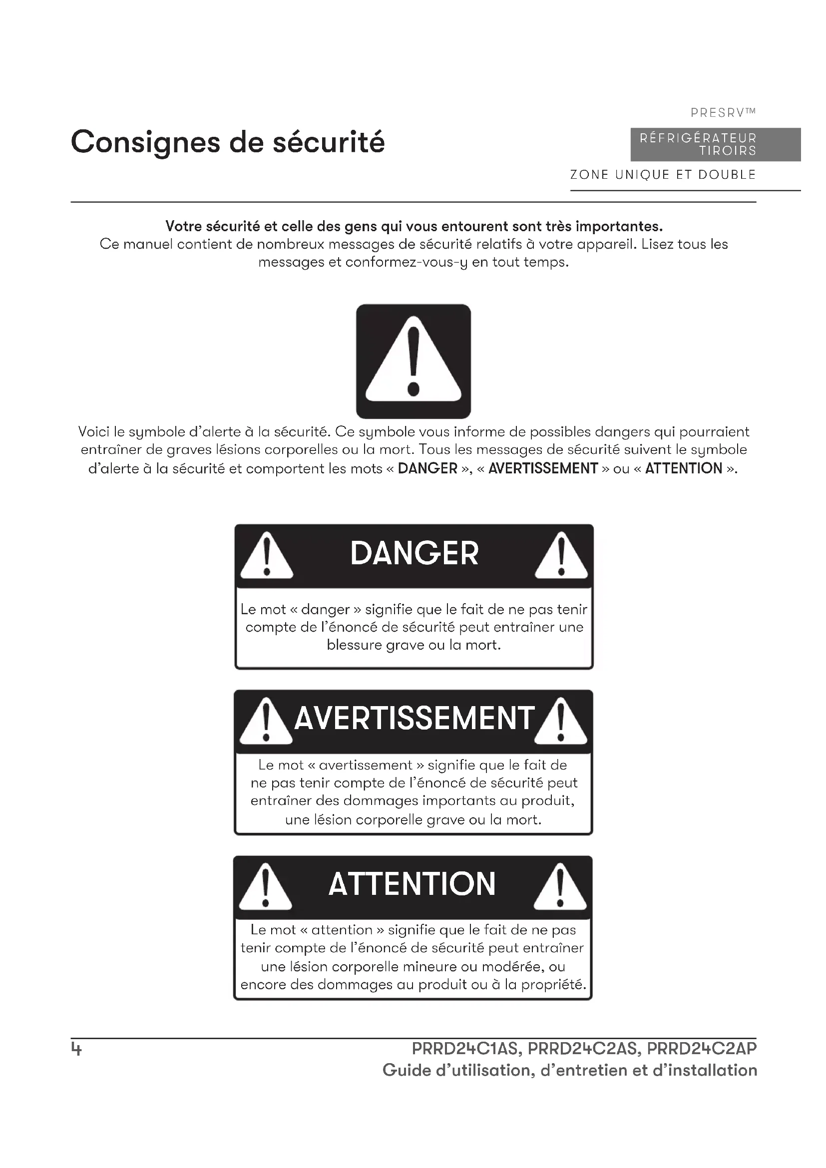 Informations sur le produit Cet appareil doit être branché à une prise électrique standard mise à la terre de 115/120 volts, c.a. de ~60 Hz. DESCRIPTION DU PRODUIT Tiroirs de réfrigérateur à zone unique Presrv™Tiroirs de réfrigérateur à double zone Presrv™Tiroirs de réfrigérateur à double zone Presrv™ prêts pour les panneauxMODÈLE ET POIDS BRUT (lb) PRRD24C1AS: 150lbPRRD24C2AS: 152lbPRRD24C2AP: 134lbTENSION/FRÉQUENCE AC 115/60HzINTENSITÉ DE COURANT 1.5ACOULEUR PRRD24C1AS: Armoire noire avec tiroirs blancsPRRD24C2AS: Armoire noire avec tiroirs en acier inoxydablePRRD24C2AP: Armoire noire avec tiroirs en acier inoxydableCAPACITÉ D’ENTREPOSAGE PRRD24C1AS: 5.4 pied cubePRRD24C2AS: 5.1 pied cubePRRD24C2AP: 5.1 pied cubeRÉFRIGÉRANT R600aPLAGE DE TEMPÉRATURES 33°F - 65°FDIMENSIONS (HxLxP) 33-7/8 po X 23-7/8 po X 24 poCAPACITÉ DE POIDS (lb) 66lb par tiroir* La capacité de stockage est basée sur 12 oz standard. boîtes et 750 ml. Bouteilles de vin de style bordelais. ٵ15 PRRD24C1AS, PRRD24C2AS, PRRD24C2AP Guide d’utilisation, d’entretien et d’installation ZEPHYRONLINE.COM