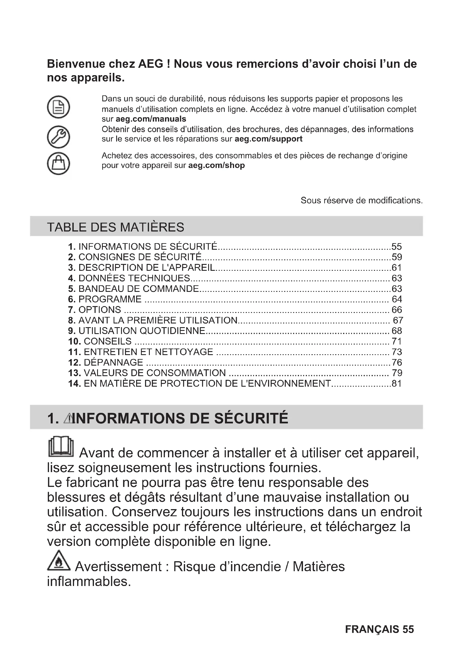 Recycle materials with the symbol . Put the packaging in relevant containers to recycle it. Help protect the environment and human health by recycling waste of electrical and electronic appliances. Do not dispose of appliances marked with the symbol with the household waste. Return the product to your local recycling facility or contact your municipal office. 54 ENGLISHBienvenue chez AEG ! Nous vous remercions d’avoir choisi l’un de nos appareils. Dans un souci de durabilité, nous réduisons les supports papier et proposons lesmanuels d’utilisation complets en ligne. Accédez à votre manuel d’utilisation completsur aeg.com/manualsObtenir des conseils d’utilisation, des brochures, des dépannages, des informationssur le service et les réparations sur aeg.com/supportAchetez des accessoires, des consommables et des pièces de rechange d’originepour votre appareil sur aeg.com/shopSous réserve de modifications.