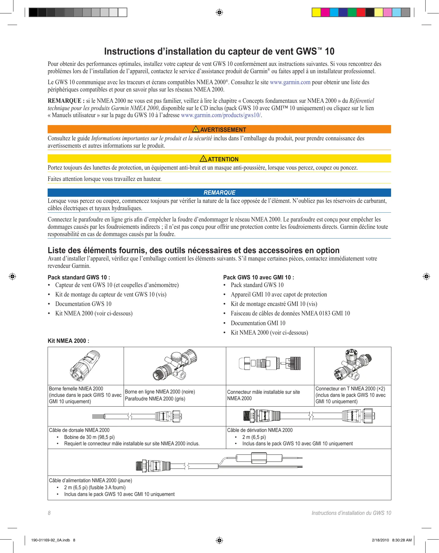 Remarque : si le NMEA 2000 ne vous est pas familier, veillez à lire le chapitre « Concepts fondamentaux sur NMEA 2000 » du Référentiel technique pour les produits Garmin NMEA 2000, disponible sur le CD inclus (pack GWS 10 avec GMI™ 10 uniquement) ou cliquez sur le lien « Manuels utilisateur » sur la page du GWS 10 à l’adresse www.garmin.com/products/gws10/. Avertissement