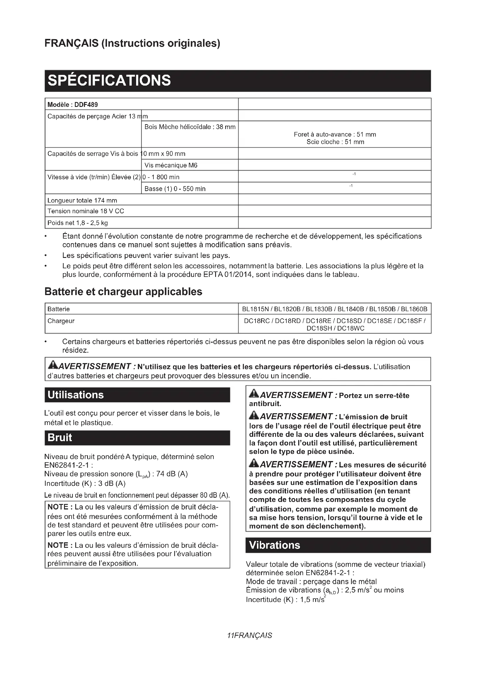 - Makitagenuinebatteryandcharger NOTE:Someitemsinthelistmaybeincludedinthe toolpackageasstandardaccessories.Theymay dierfromcountrytocountry.11 FRANÇAIS FRANÇAIS (Instructions originales) SPÉCIFICATIONS Modèle : DDF489 Capacités de perçage Acier 13 mm Bois Mèche hélicoïdale : 38 mm Foret à auto-avance : 51 mm Scie cloche : 51 mm Capacités de serrage Vis à bois 10 mm x 90 mm Vis mécanique M6 Vitesse à vide (tr/min) Élevée (2) 0 - 1 800 min