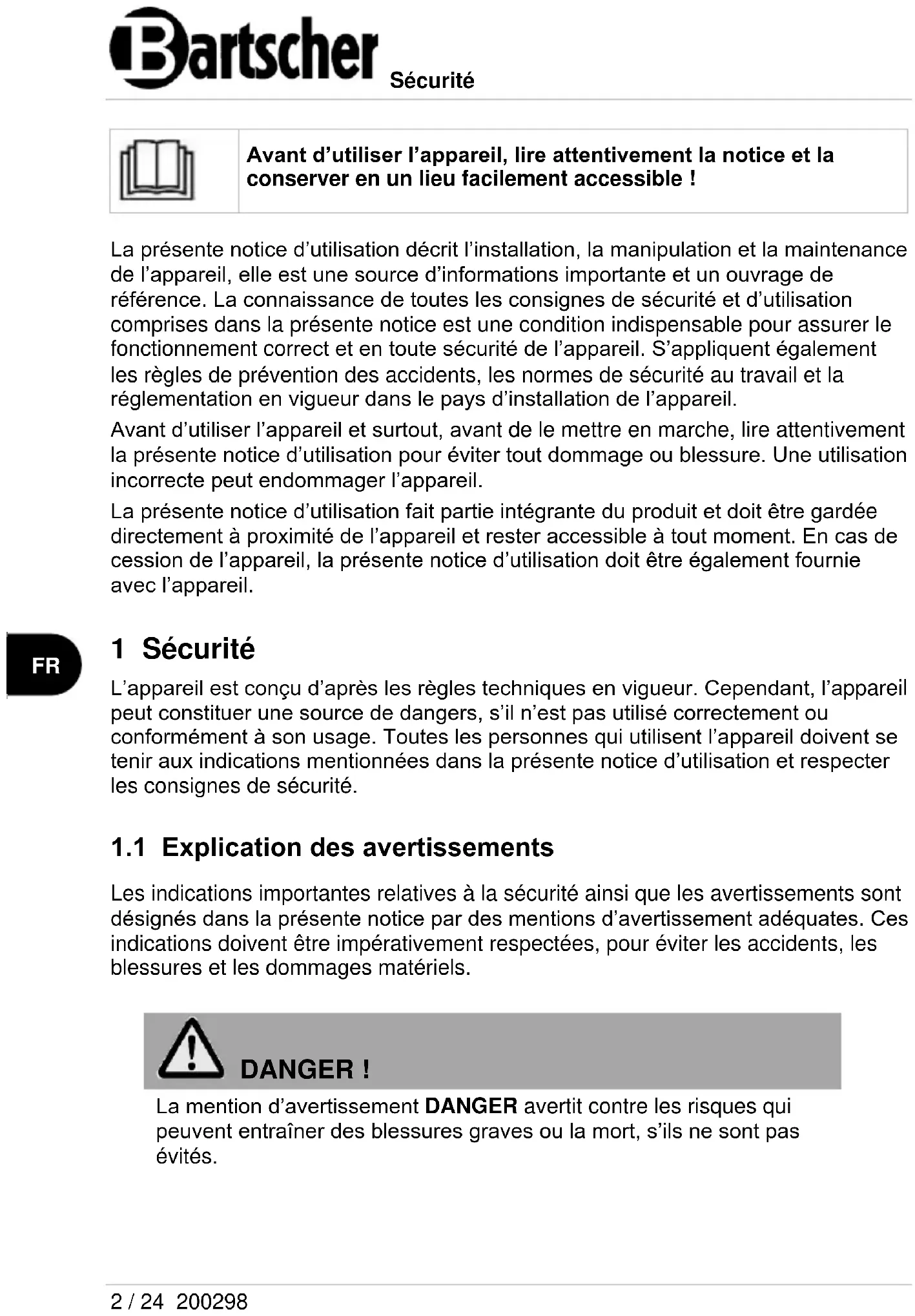 - Il est interdit de changer ou de modifier l’appareil ou ses éléments.Sécurité 6 / 24 200298