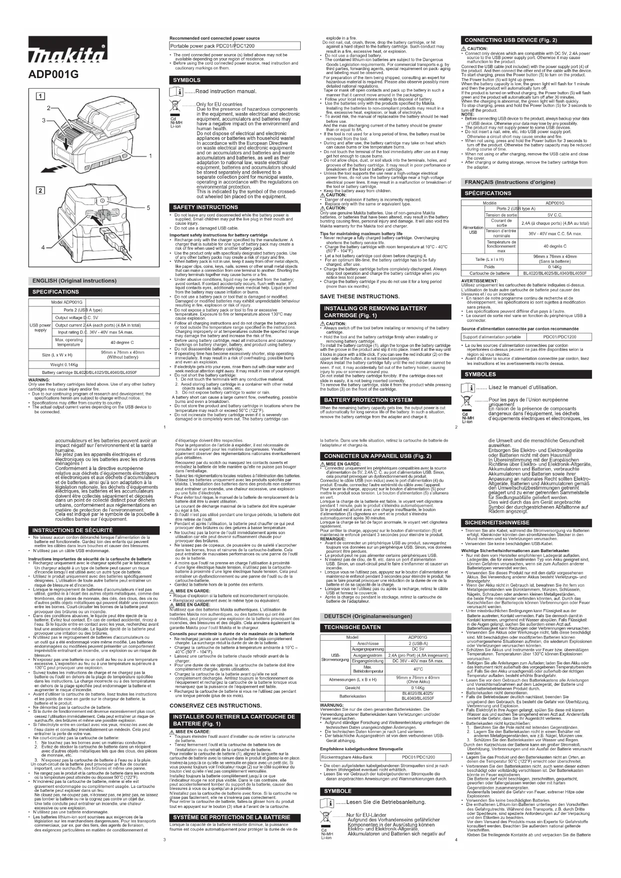 - After charging or during storage, remove the battery cartridge from the adapter. FRANÇAIS (Instructions d’origine) SPÉCIFICATIONS Modèle ADP001G Alimentation USB Ports 2 (USB type A) Tension de sortie 5V C.C. Courant de sortie 2,4A (à chaque ports) (4,8A au total) Tension d’entrée nominale 36V - 40V max C.C. 5A max. Température de fonctionnement max 40 degrés C Taille (L x l x H) 96mm x 76mm x 40mm (Sans la batterie) Poids 0.14Kg Cartouche de batterie BL4020/BL4025/BL4040/BL4050F