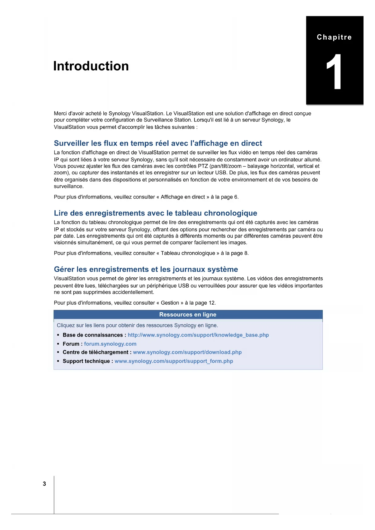 Merci d'avoir acheté le Synology VisualStation. Le VisualStation est une solution d'affichage en direct conçue pour compléter votre configuration de Surveillance Station. Lorsqu'il est lié à un serveur Synology, le VisualStation vous permet d'accomplir les tâches suivantes : Surveiller les flux en temps réel avec l'affichage en direct La fonction d'affichage en direct de VisualStation permet de surveiller les flux vidéo en temps réel des caméras IP qui sont liées à votre serveur Synology, sans qu'il soit nécessaire de constamment avoir un ordinateur allumé. Vous pouvez ajuster les flux des caméras avec les contrôles PTZ (pan/tilt/zoom – balayage horizontal, vertical et zoom), ou capturer des instantanés et les enregistrer sur un lecteur USB. De plus, les flux des caméras peuvent être organisés dans des dispositions et personnalisés en fonction de votre environnement et de vos besoins de surveillance. Pour plus d'informations, veuillez consulter « Affichage en direct » à la page 6. Lire des enregistrements avec le tableau chronologique La fonction du tableau chronologique permet de lire des enregistrements qui ont été capturés avec les caméras IP et stockés sur votre serveur Synology, offrant des options pour rechercher des enregistrements par caméra ou par date. Les enregistrements qui ont été capturés à différents moments ou par différentes caméras peuvent être visionnés simultanément, ce qui vous permet de comparer facilement les images. Pour plus d'informations, veuillez consulter « Tableau chronologique » à la page 8. Gérer les enregistrements et les journaux système VisualStation vous permet de gérer les enregistrements et les journaux système. Les vidéos des enregistrements peuvent être lues, téléchargées sur un périphérique USB ou verrouillées pour assurer que les vidéos importantes ne sont pas supprimées accidentellement. Pour plus d'informations, veuillez consulter « Gestion » à la page 12. Ressources en ligne Cliquez sur les liens pour obtenir des ressources Synology en ligne. Base de connaissances : http://www.synology.com/support/knowledge_base.php Forum : forum.synology.com Centre de téléchargement : www.synology.com/support/download.php Support technique : www.synology.com/support/support_form.php4