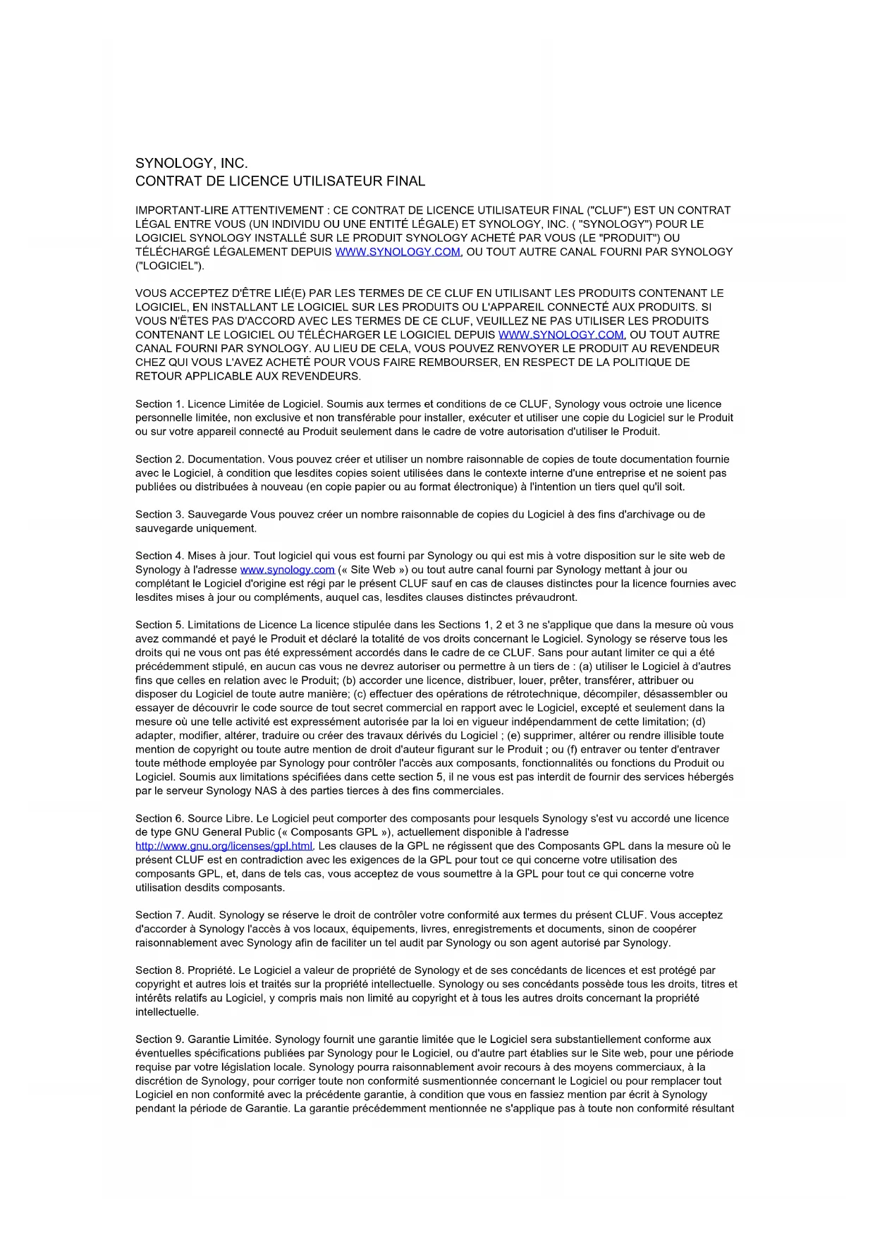 Section 7. Audit. Synology se réserve le droit de contrôler votre conformité aux termes du présent CLUF. Vous acceptez